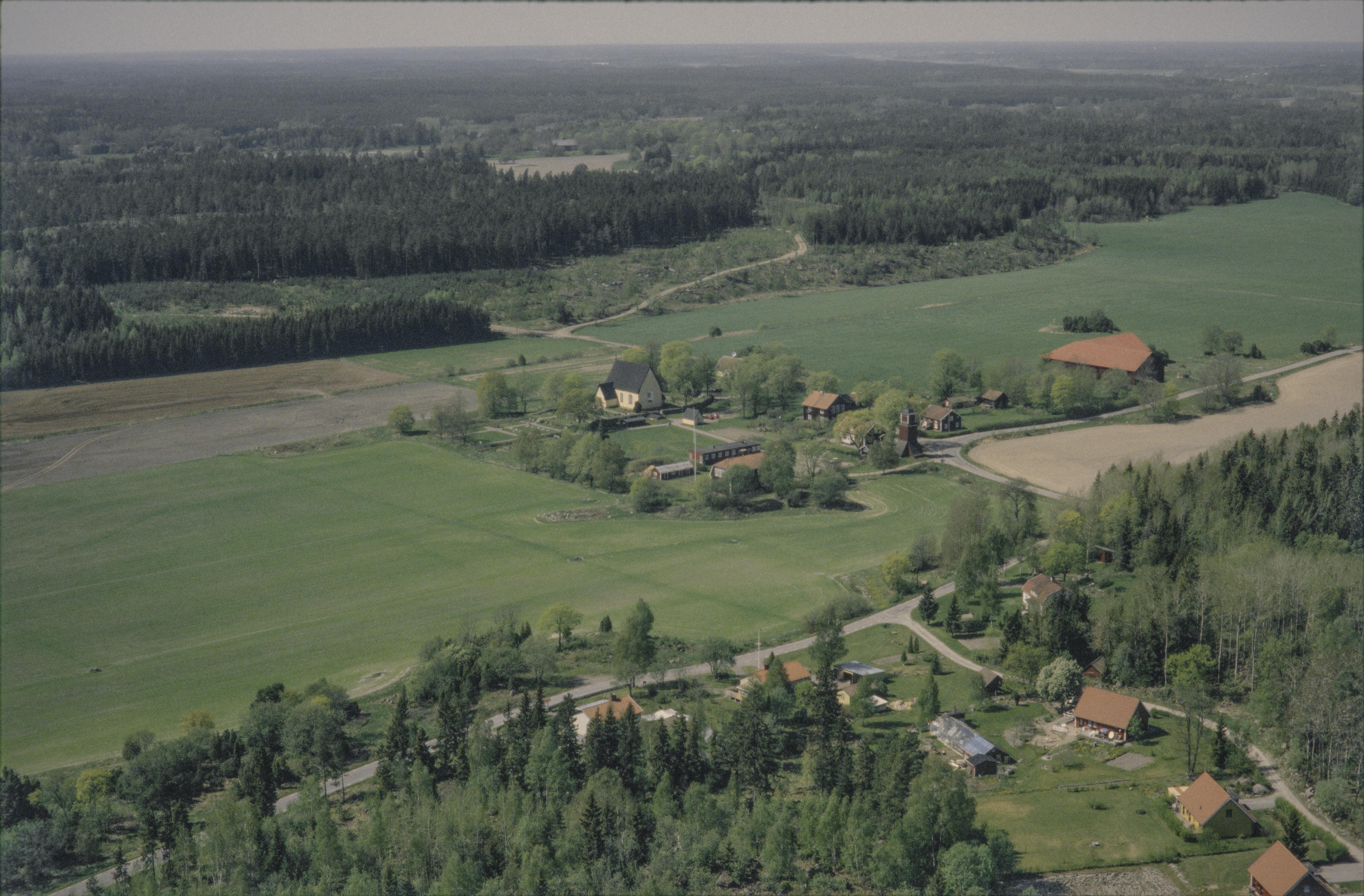 Beskrivning: Bladåkers kyrka i kyrkbyn Bladåkersby. Faringe socken i bildens övre kant. Bilden är tagen mot (väderstreck): SV