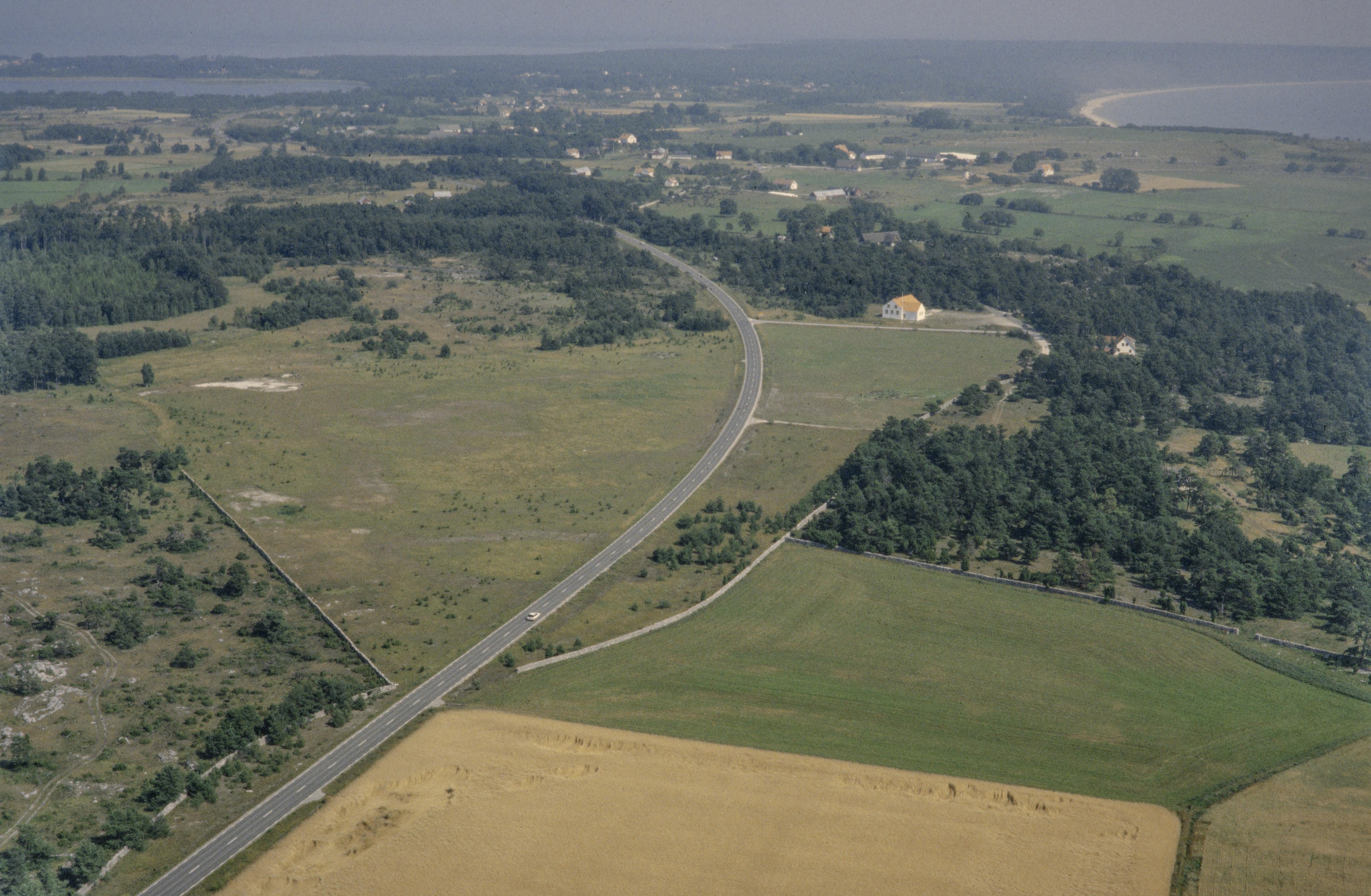 Beskrivning: I bildens övre del byarna Stora Gasmora och Ringvida. Till höger över bildens mitt hembygdsgården vid gården Nystugu. I skogen bak gården kalkugnsruin RAÄnr Fårö 354:1. Bilden är tagen mot (väderstreck): NO