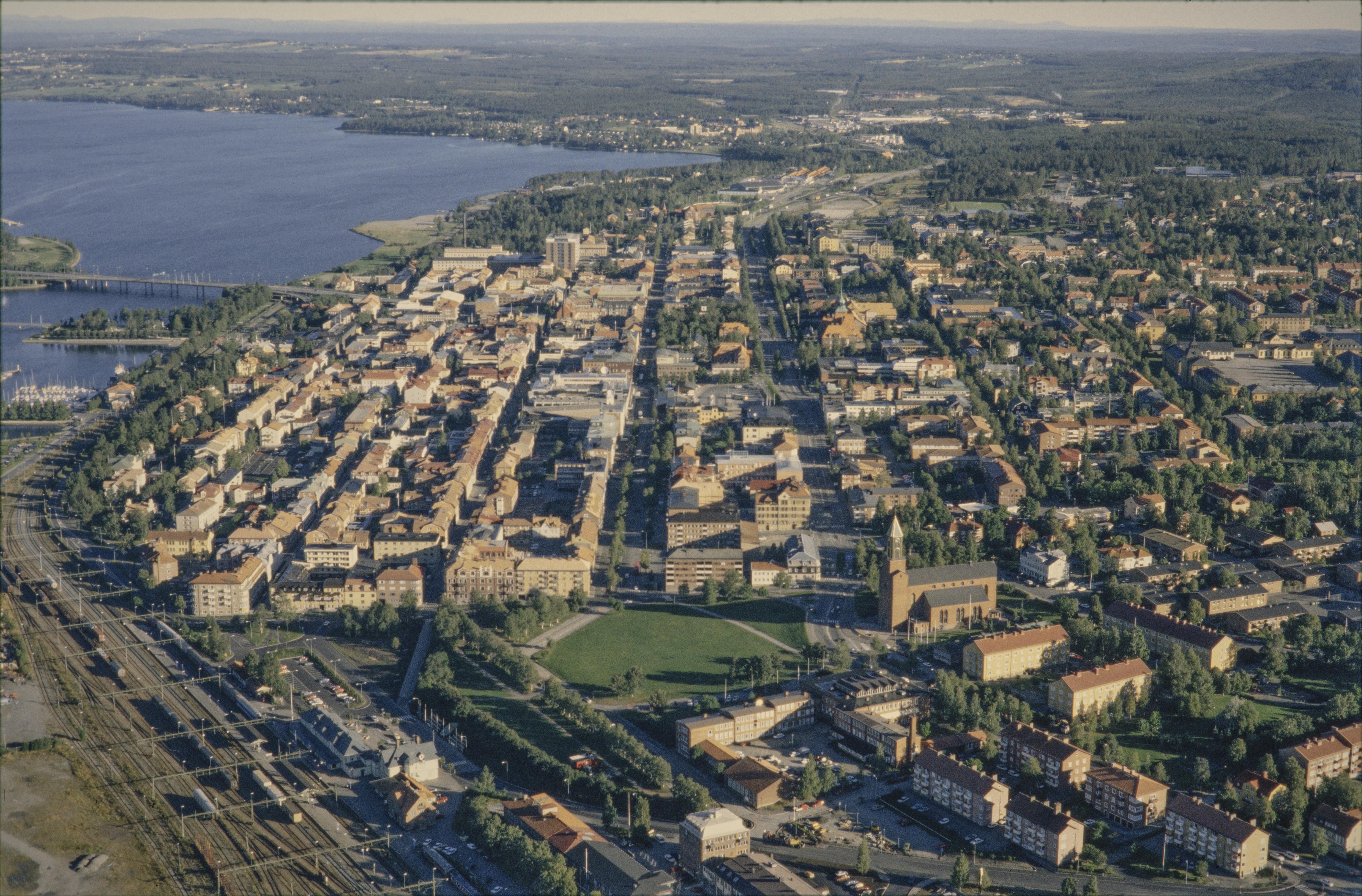 Beskrivning: Östersunds stad vid Åssjön. Stora kyrkan till höger under bildens mitt. Vid bron till vänster över bildens mitt bytomt RAÄnr Östersund 56:1. Bilden är tagen mot (väderstreck): N
