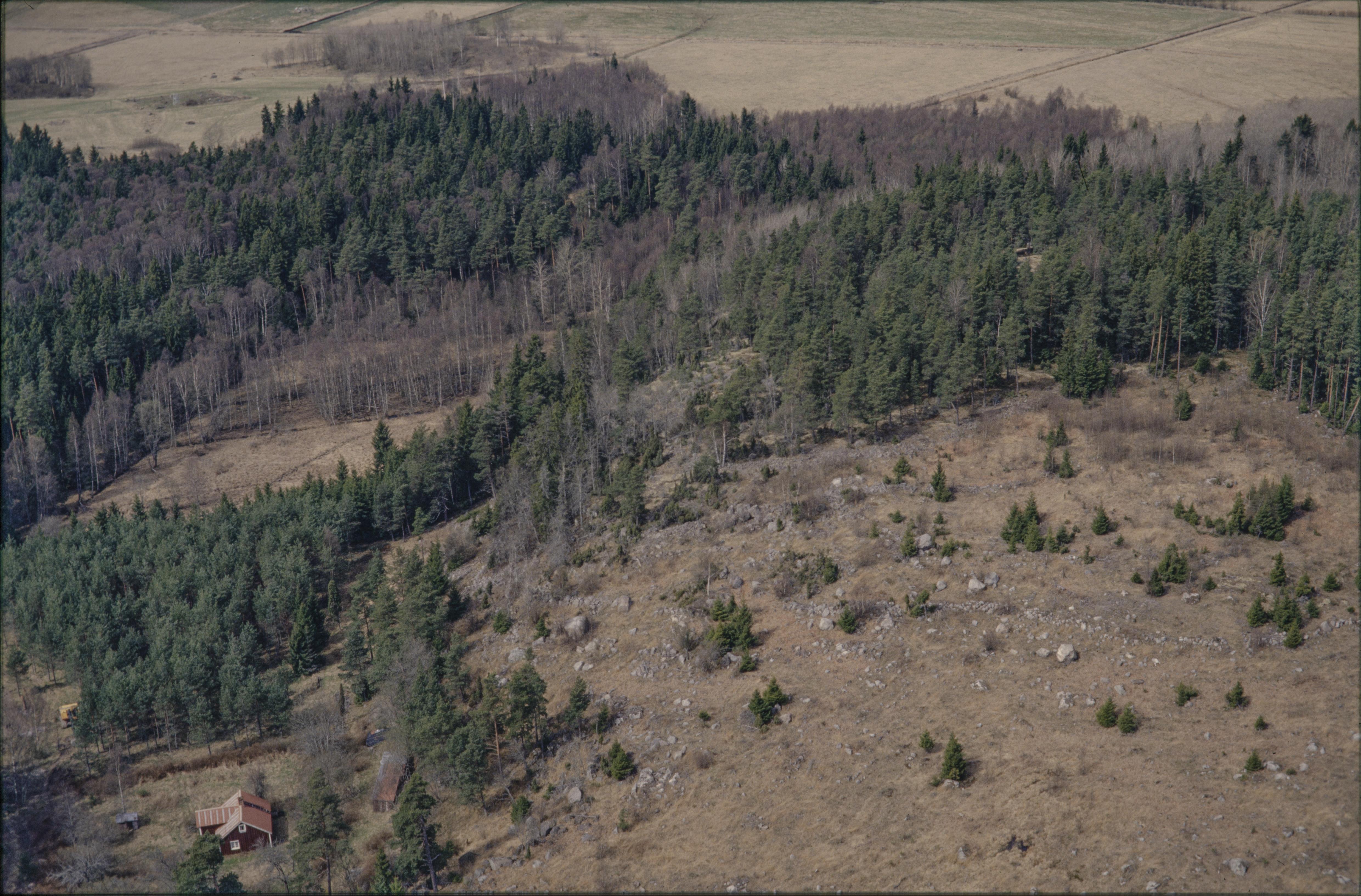 Beskrivning: Rössberga innan bygge av järnväg (Arlandabanan) i Rickebyåns dalgång i områden sydost om Svartsjön. Nere till vänster boplats RAÄnr Odensala 403:1 och till höger fornborg Odensala 159:1. Bilden är tagen mot (väderstreck): V