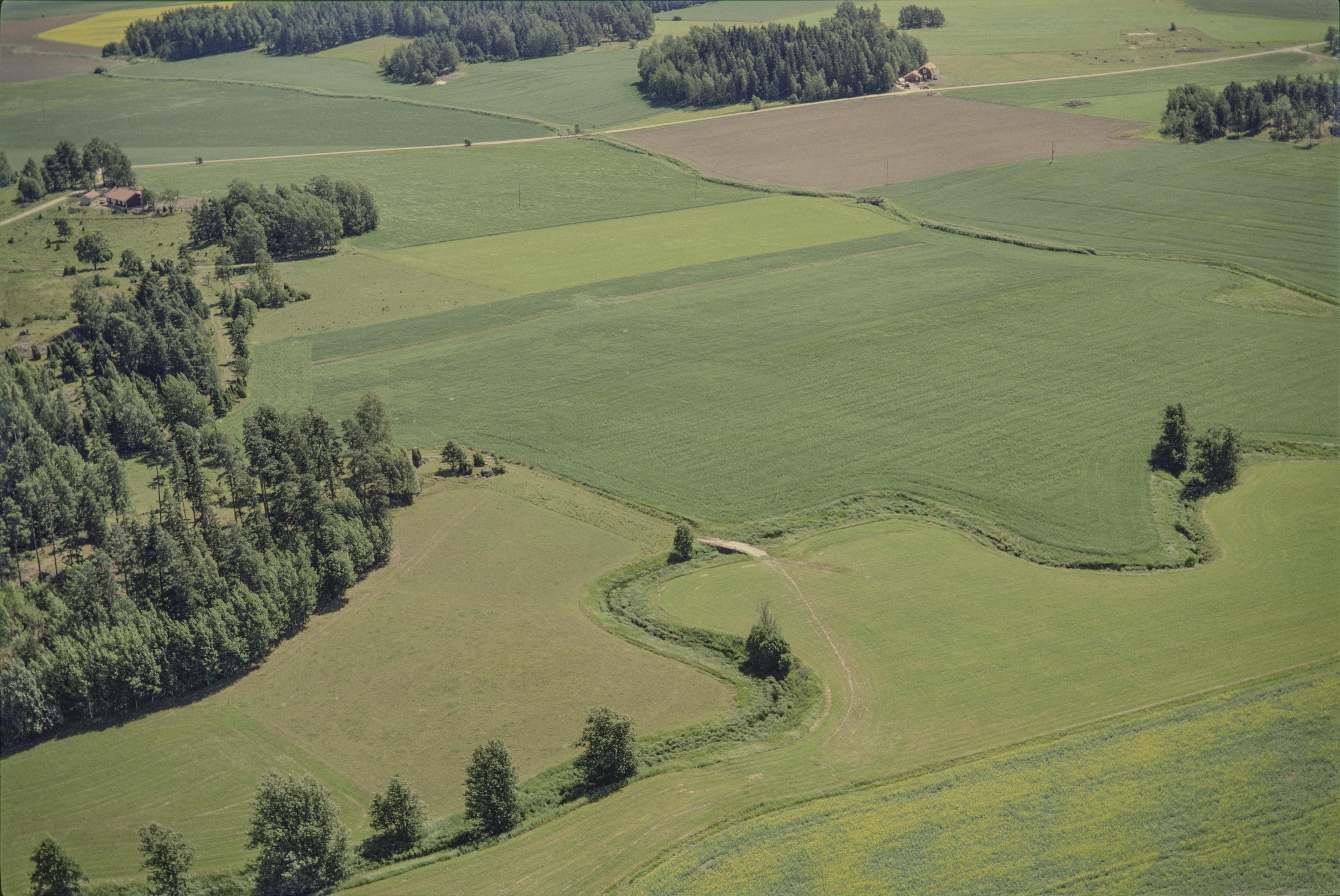 Beskrivning: Till vänster Kansta by i Kanstabäckens dalgång. Vid bildens mitt gravfält Munktorp 268:1 vid Kanstabäcken. Nere till vänster gränsen mot socknet Köping. Bilden är tagen mot (väderstreck): SO