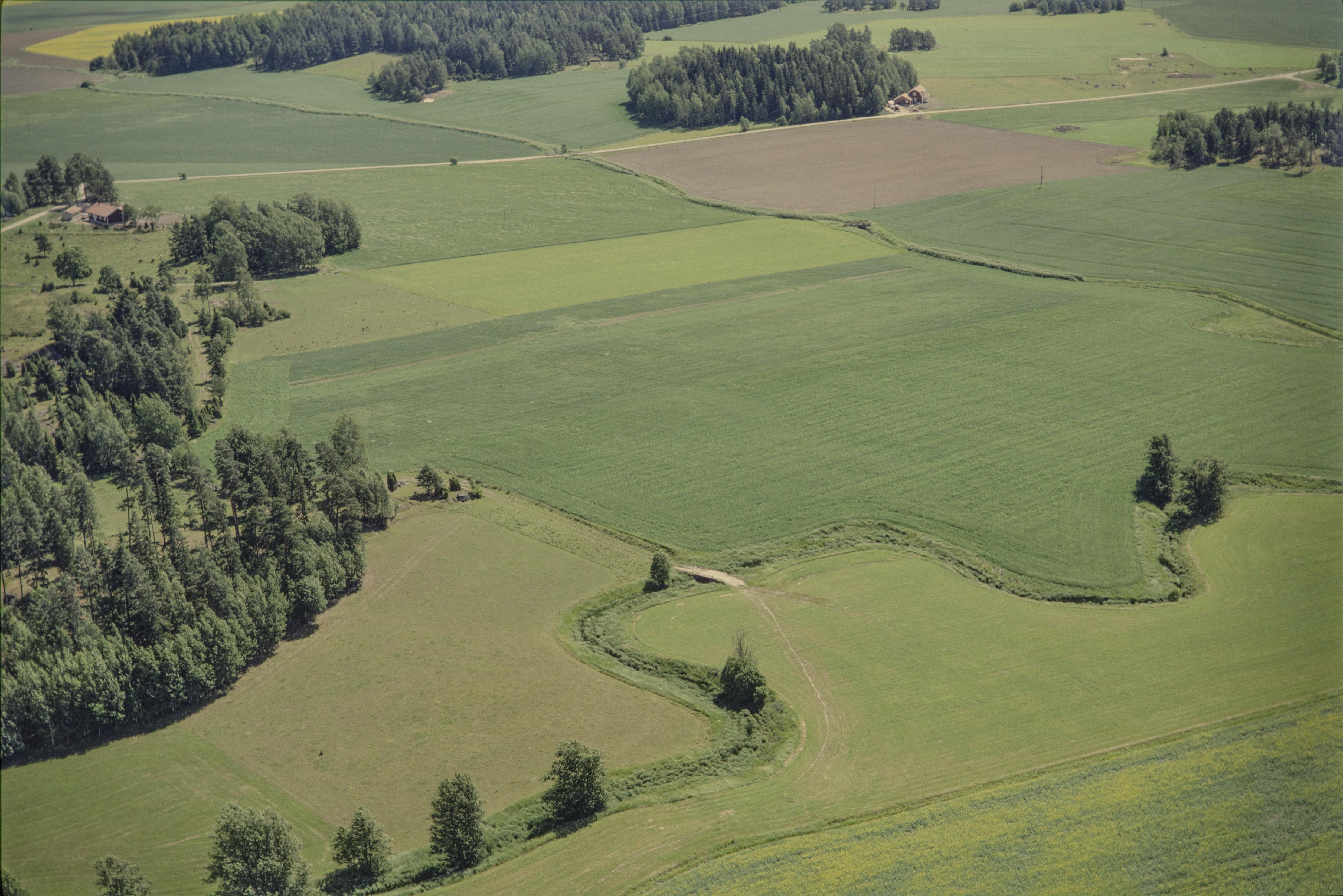 Beskrivning: Till vänster Kansta by i Kanstabäckens dalgång. Vid bildens mitt gravfält Munktorp 268:1 vid Kanstabäcken. Nere till vänster gränsen mot socknet Köping. Bilden är tagen mot (väderstreck): SO
