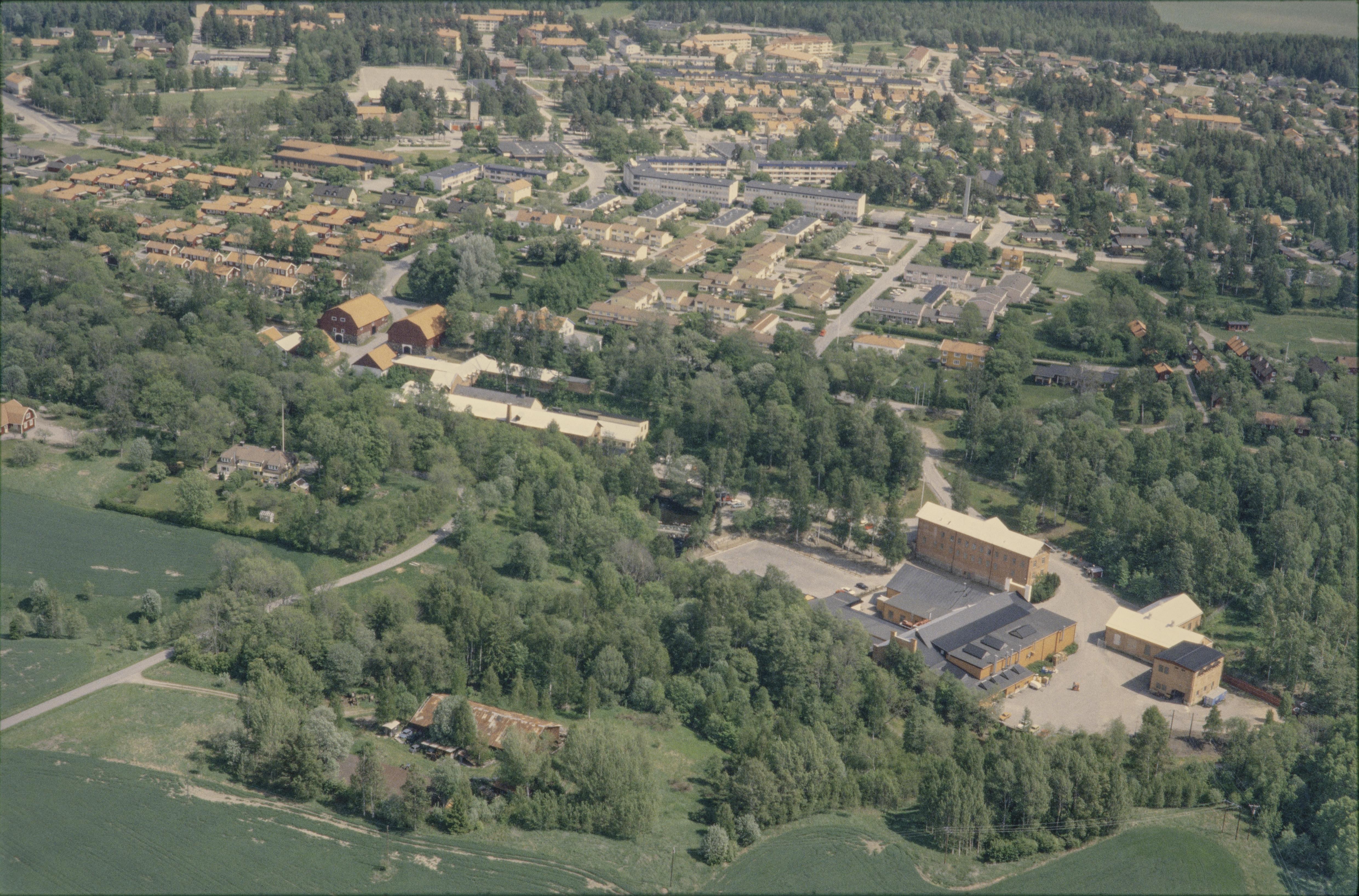 Beskrivning: Skultuna tätort och bruk i Svartåns dalgång. Under bildens mitt brukslämningar RAÄnr Skultuna 224:1, 225:1 m.fl. Bilden är tagen mot (väderstreck): ONO