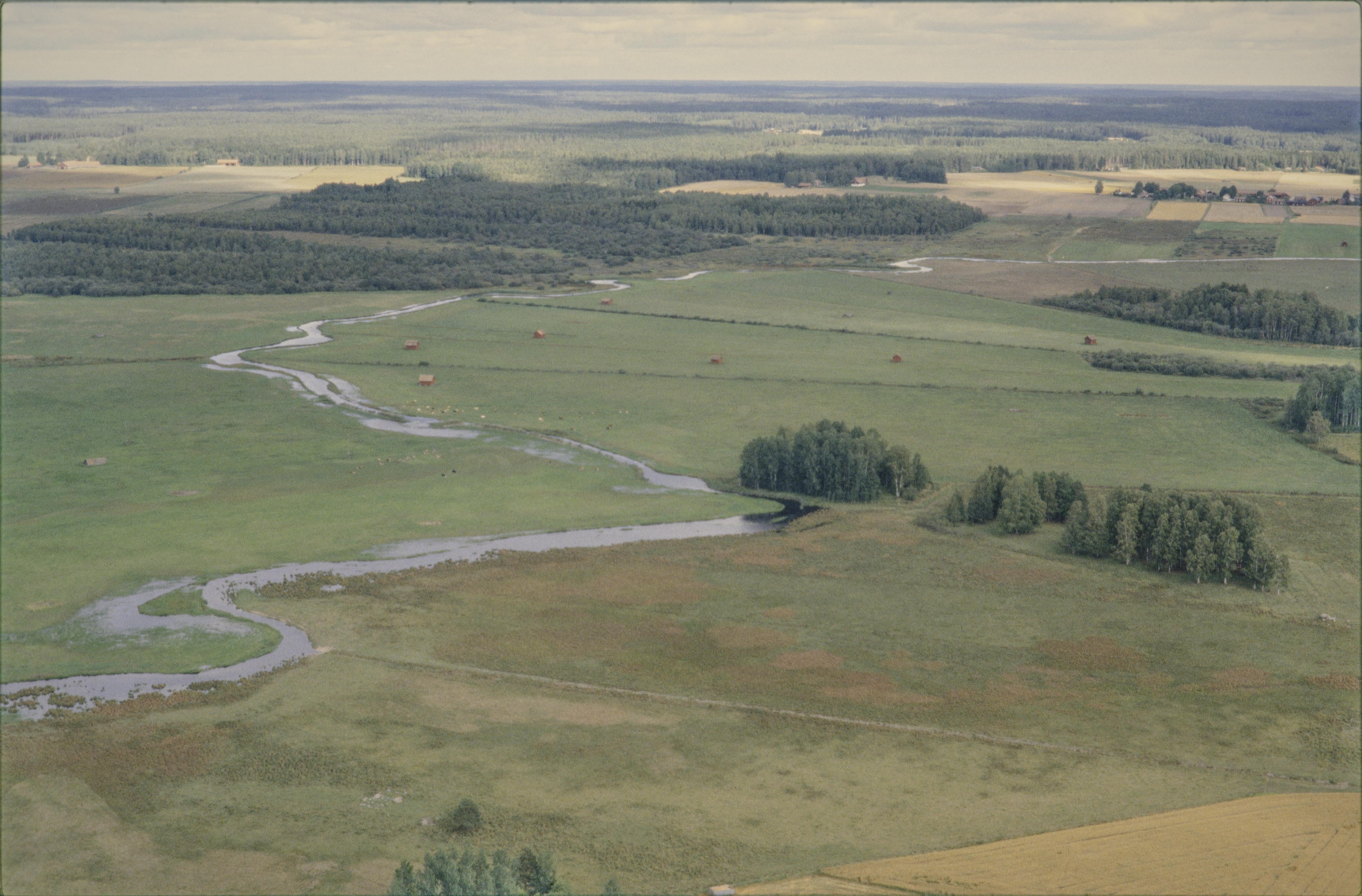Beskrivning: Våtmarksområdet Nötmyran i Svartåns dalgång, söder om Ösby. Vid bildens mitt fyndplats (stenyxor) RAÄnr Västerfärnebo 428:1. Uppe till höger färdväg Smäckvägen mot bro RAÄnr Västerfärnebo 314:1-2 vid Hedbo by. Bilden är tagen mot (väderstreck): Ö