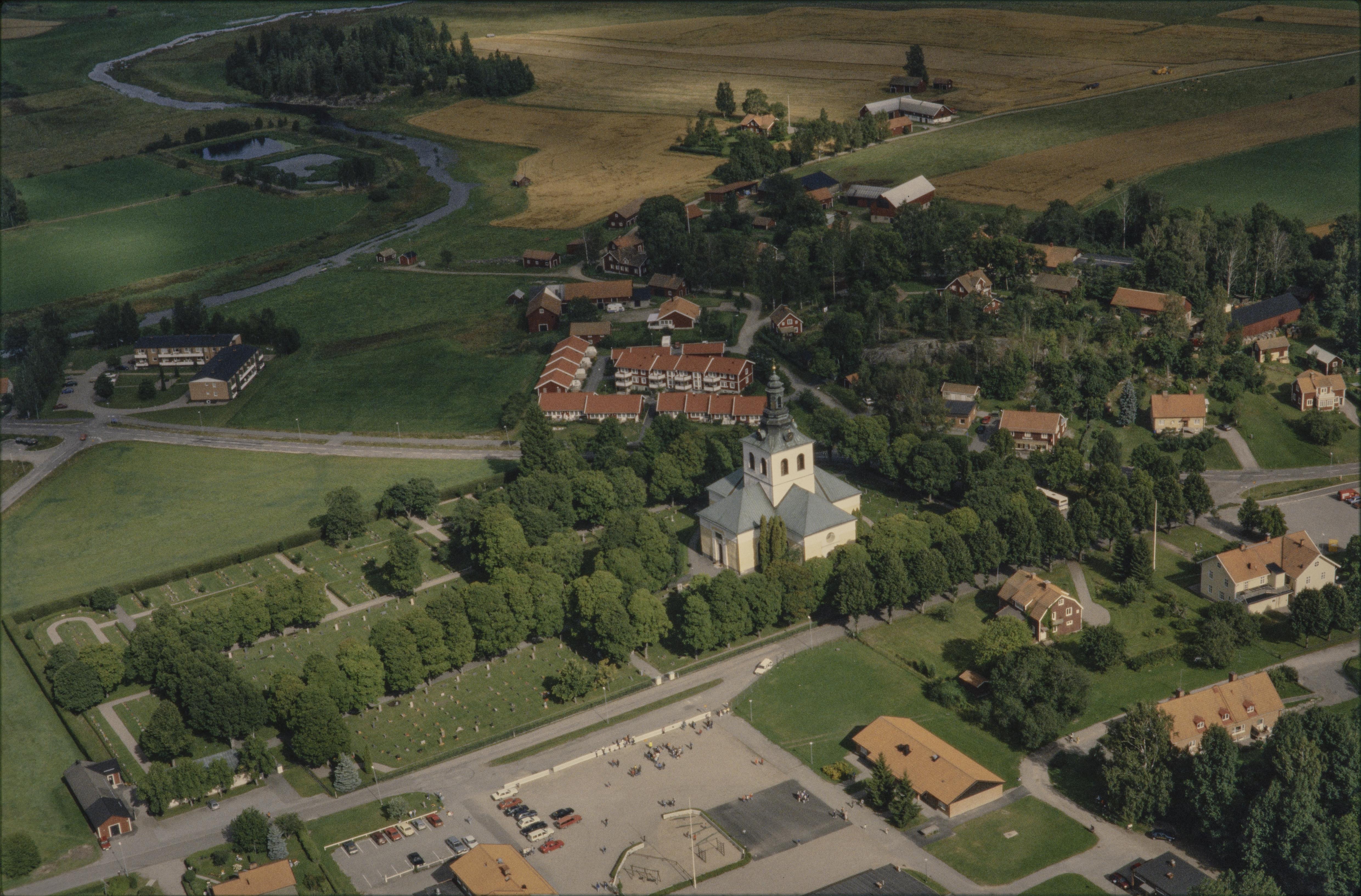 Beskrivning: Västerfärnebo kyrka och kyrkby i Svartåns dalgång. Vid kyrkan fyndplats (bl.a. flintgods) RAÄnr Västerfärnebo 588. Bilden är tagen mot (väderstreck): NO
