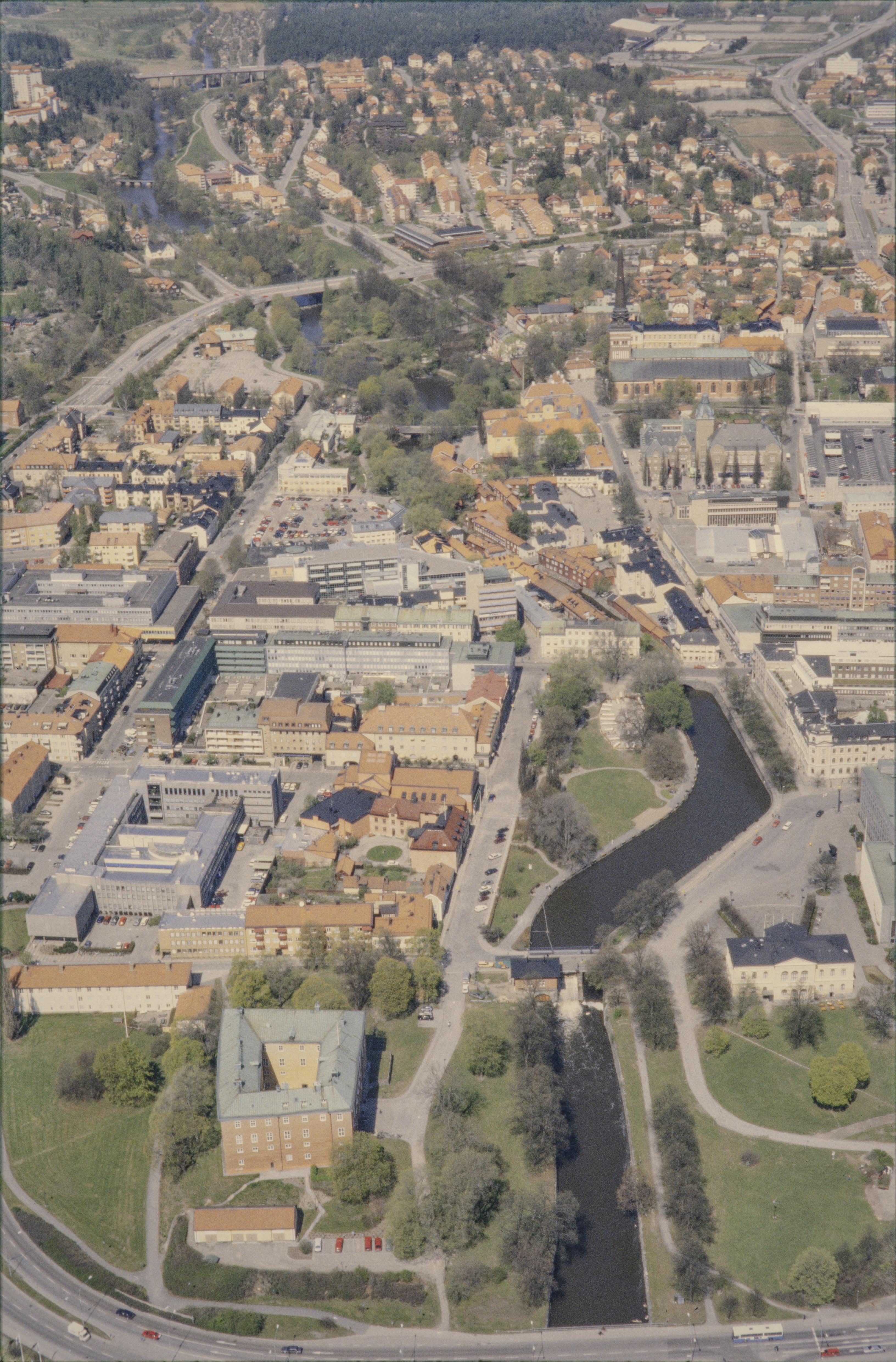 Beskrivning: Västerås stad vid Svartån och Västeråsfjärden i Mälaren. Stadslager RAÄnr Västerås 232:1. Nere till vänster statliga byggnadsminnet RAÄnr Västerås 224:1 Västerås slott. Till höger över bildens mitt Västerås domkyrka. Bilden är tagen mot (väderstreck): NNV
