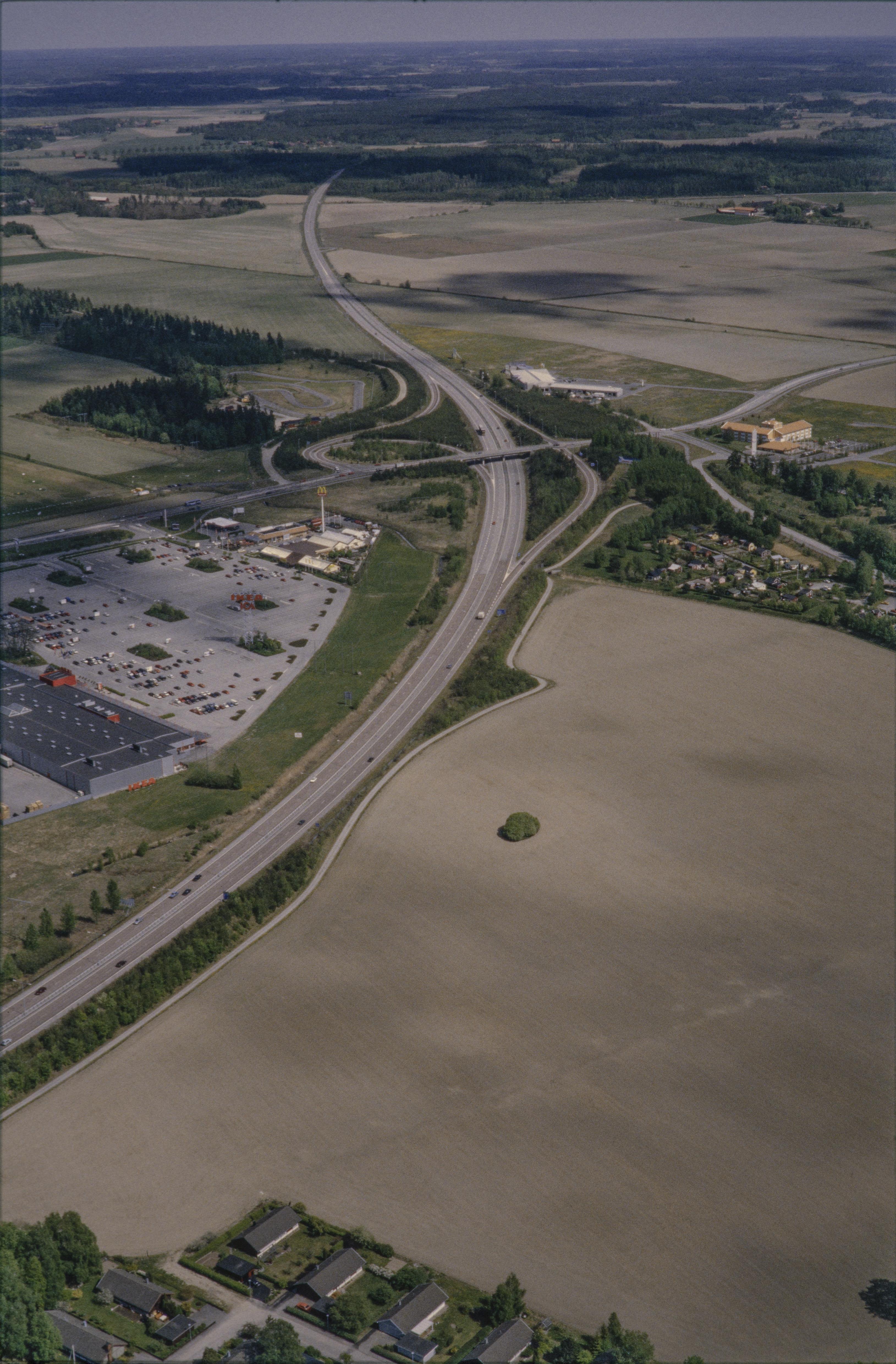 Beskrivning: Trafikplats Hällamotet i stadsdelen Hälla i östra delen av Västerås stad. I vägkorsningen vid bildens mitt gravfält RAÄnr Västerås 450:1. Bilden är tagen mot (väderstreck): NO
