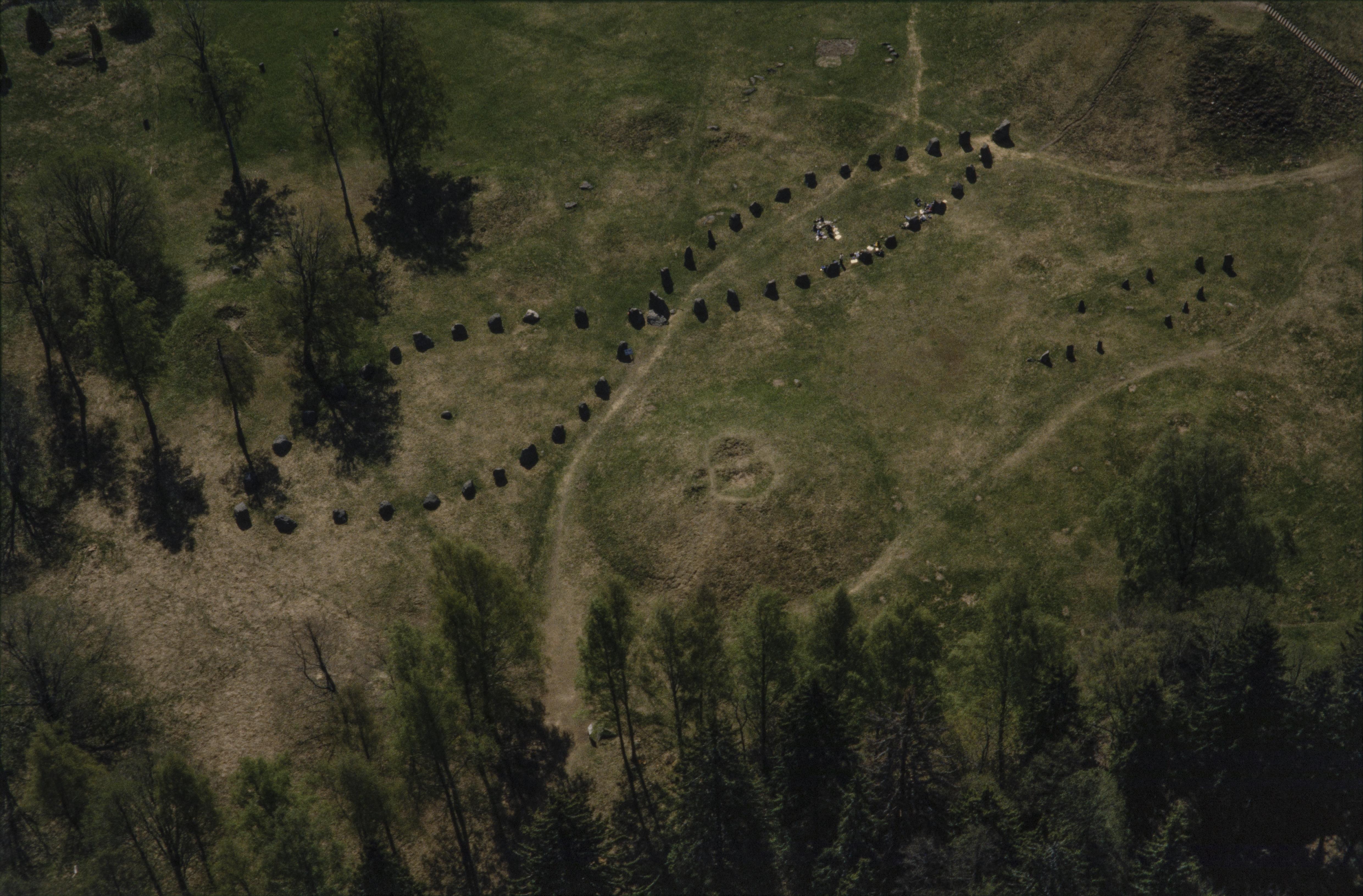 Beskrivning: Fornlämningsområdet Anundshög RAÄnr Västerås 431:1 vid Badelundaåsen i Badelunda. I området finns storhög, skeppssättningar, väglämningar och runsten m.m. Bilden är tagen mot (väderstreck): S