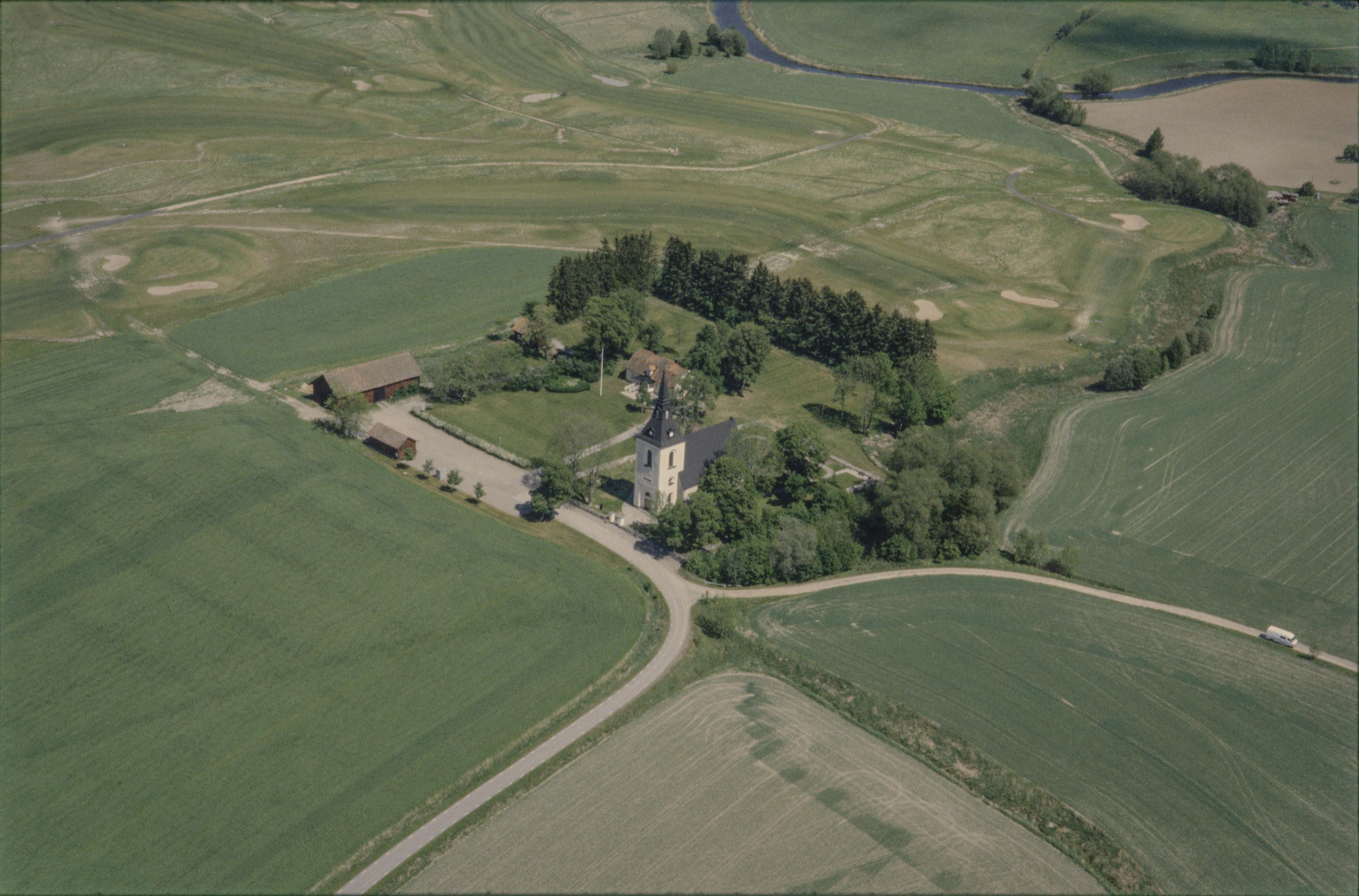 Beskrivning: Skerike kyrka vid bildens mitt. Svartån uppe till höger. Bilden är tagen mot (väderstreck): NO