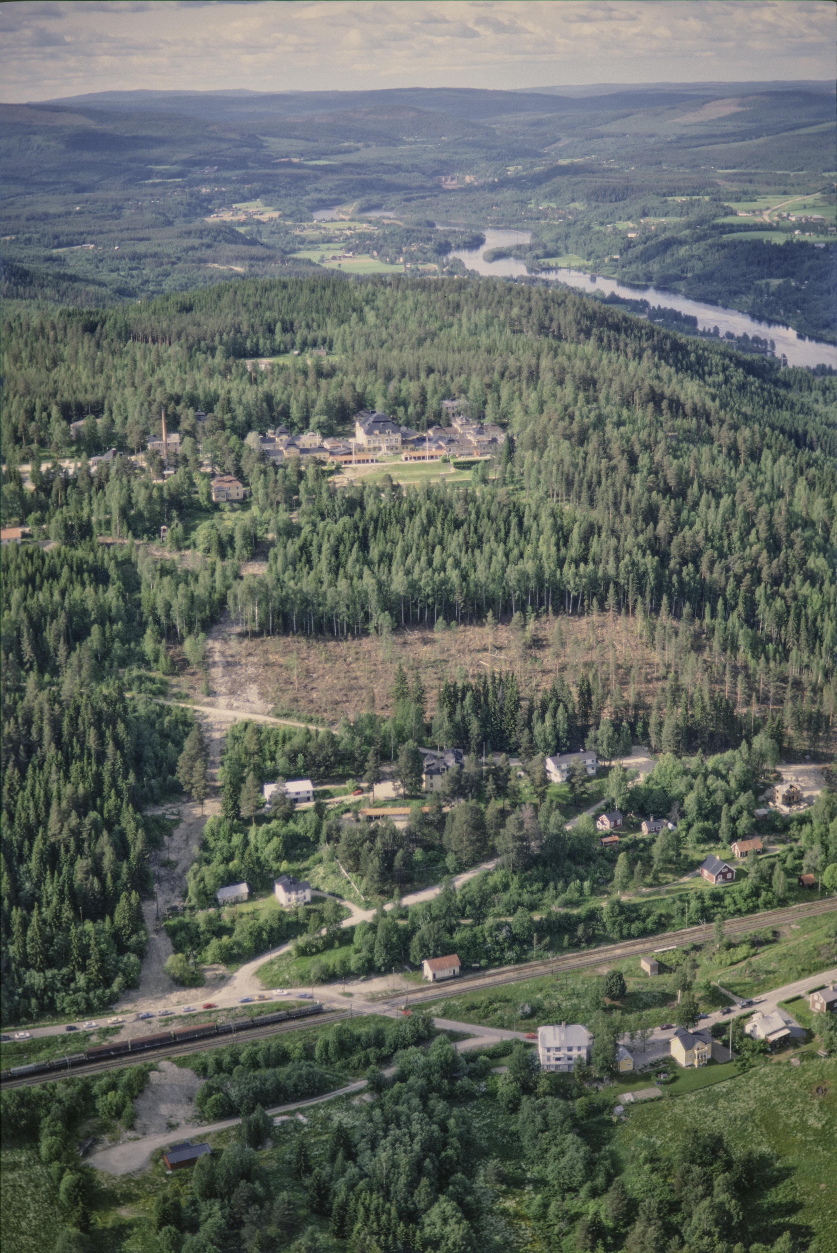 Beskrivning: Orten Österås där Ångermanälven och Faxälven möts. Över bildens mitt byggnadsminnet Österåsens sanatorium och minnesstenen RAÄnr Ed 81:1. Gränsen mot Sollefteå socken nere till höger. Bilden är tagen mot (väderstreck): N