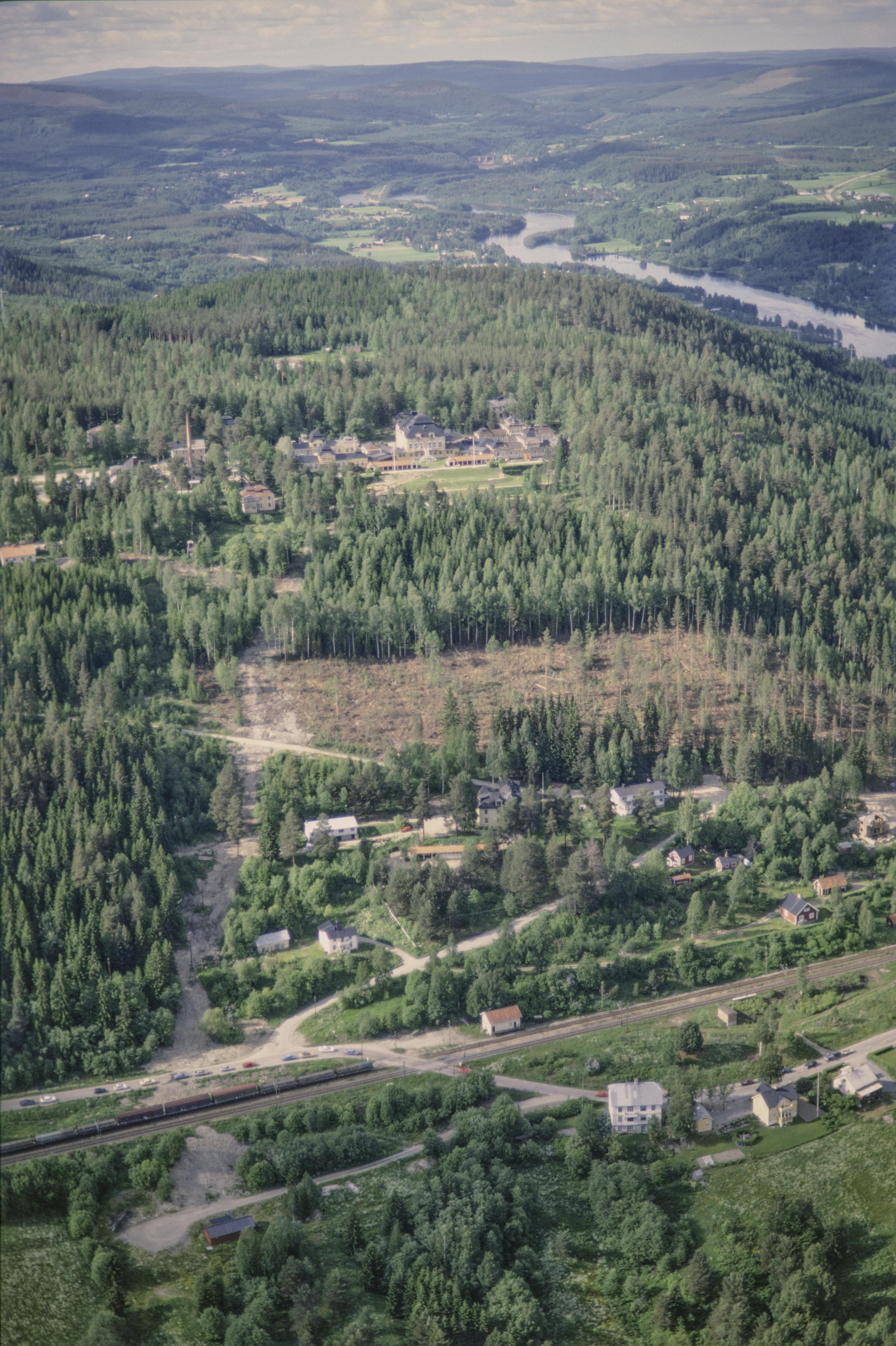 Beskrivning: Orten Österås där Ångermanälven och Faxälven möts. Över bildens mitt byggnadsminnet Österåsens sanatorium och minnesstenen RAÄnr Ed 81:1. Gränsen mot Sollefteå socken nere till höger. Bilden är tagen mot (väderstreck): N