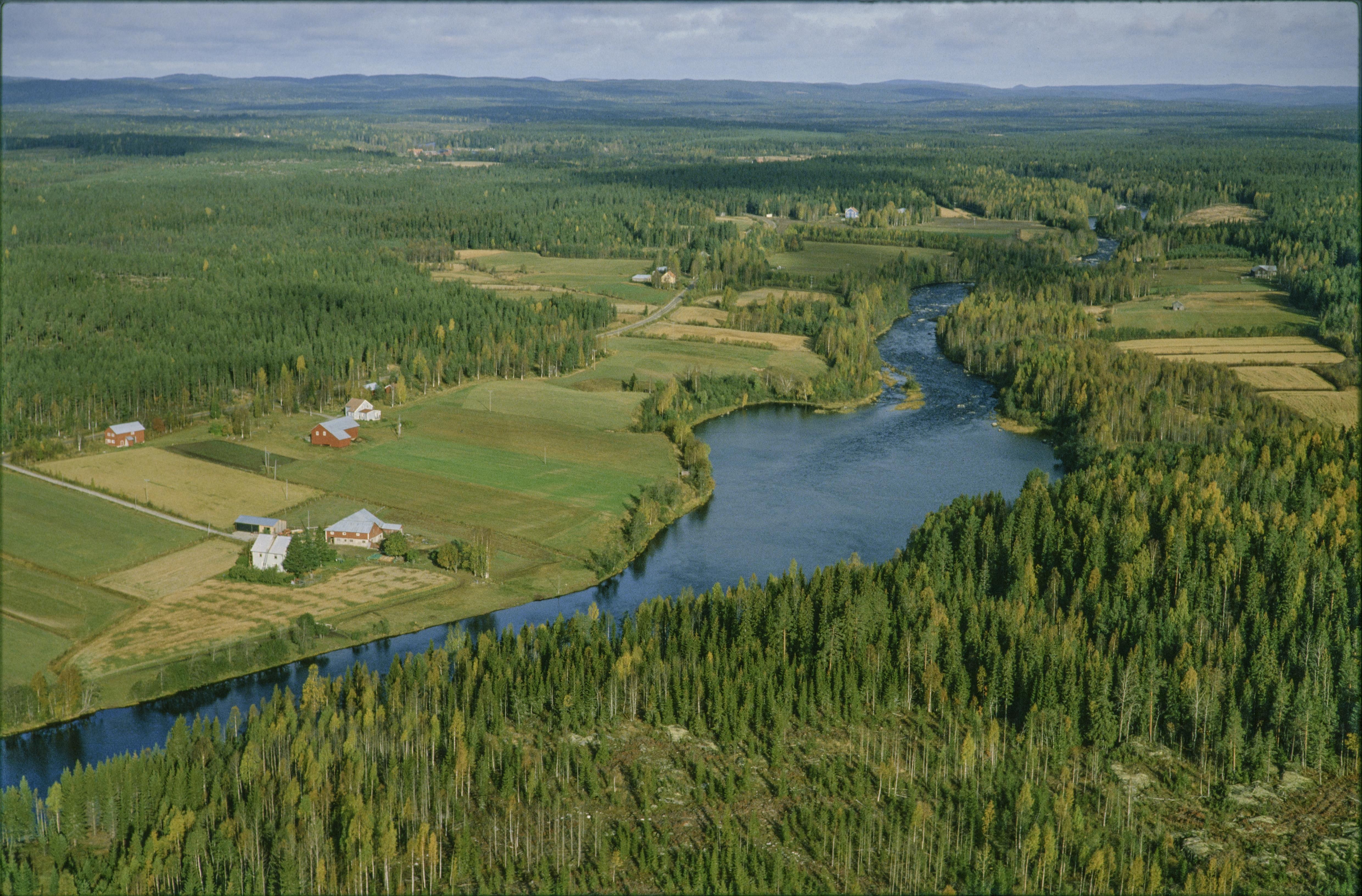 Beskrivning: Gideåälven vid Långselet, sydost om Gideåbruk. Älven markeraar gränsen mellan socknen Gideå (bildens vänstra och övre del) och Grundsunda (nedre och högra del). I mitten i bildens högra kant fyndplats (redskap) RAÄnr Grundsunda 167:1 vid gården Hälsinggrubban. Till vänster om bildens mitt området Väster-Eldsmark i Gideå socken. Bilden är tagen mot (väderstreck): NV