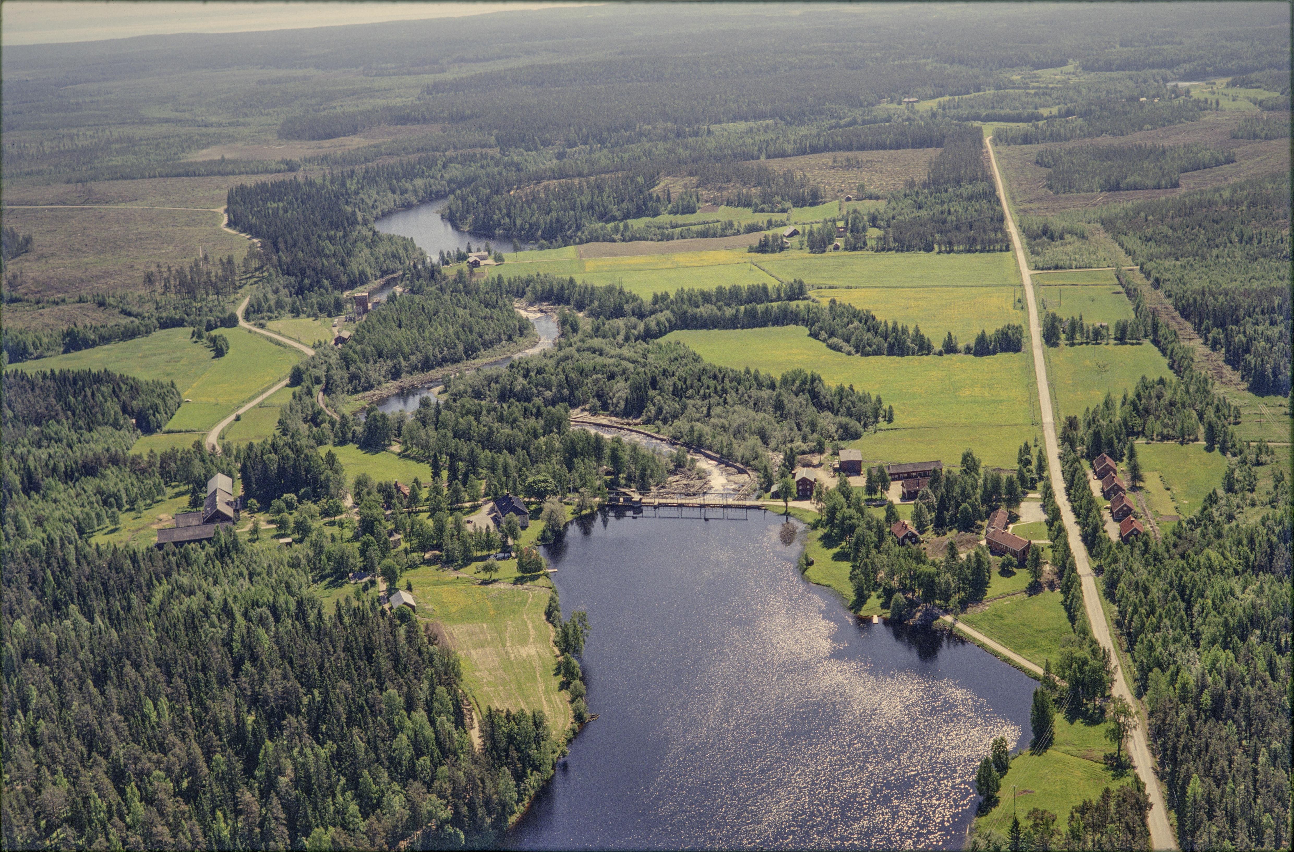 Beskrivning: Gideåbruk (skrivs även Gideå bruk) i Gideälven. Vid bildens mitt område med järnbrukslämningar RAÄnr Gideå 5:1. Bilden är tagen mot (väderstreck): SO