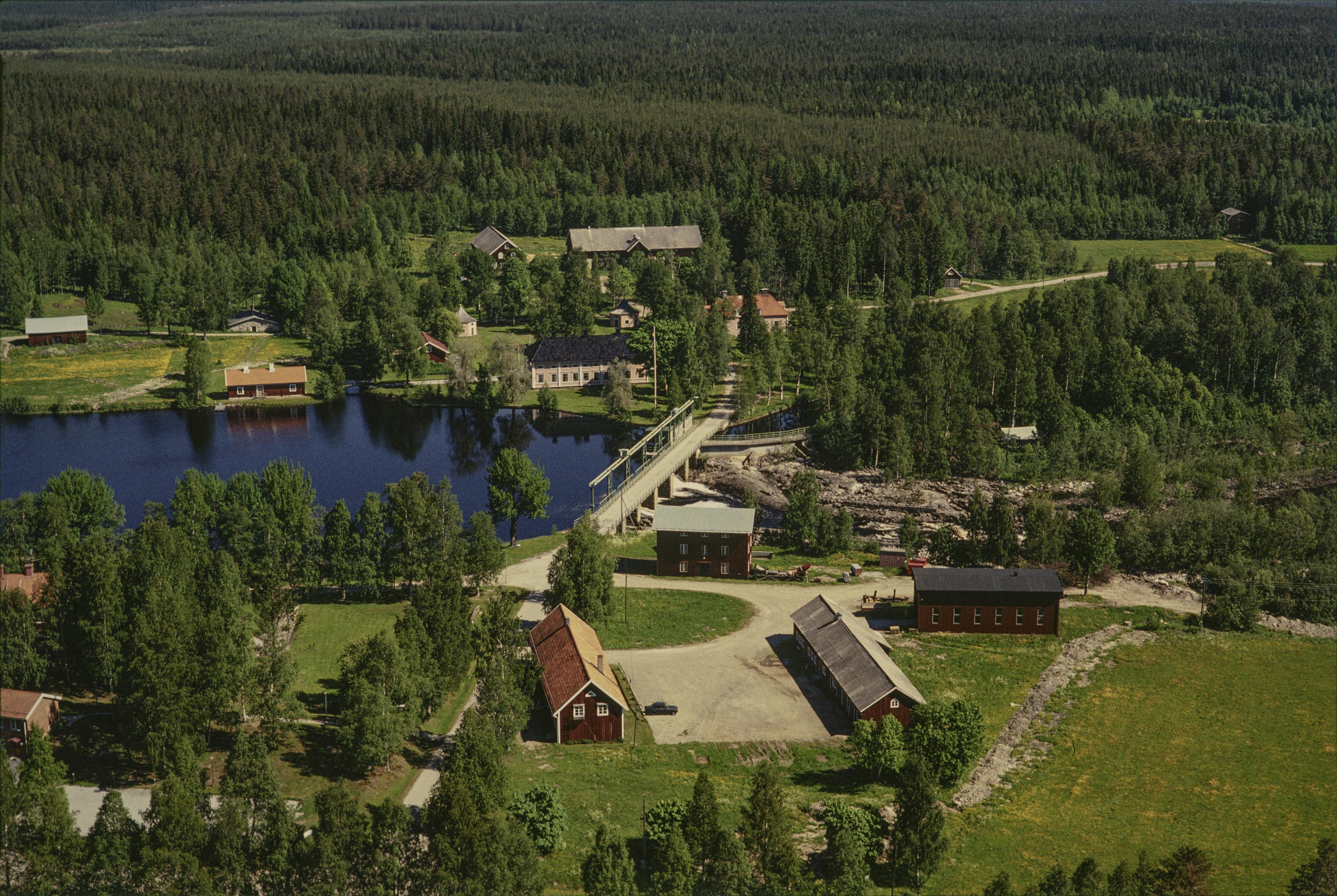 Beskrivning: Gideåbruk (skrivs även Gideå bruk) i Gideälven. Område med järnbrukslämningar RAÄnr Gideå 5:1. Vid bildens mitt Gideåbruks herrgård. Bilden är tagen mot (väderstreck): NNO