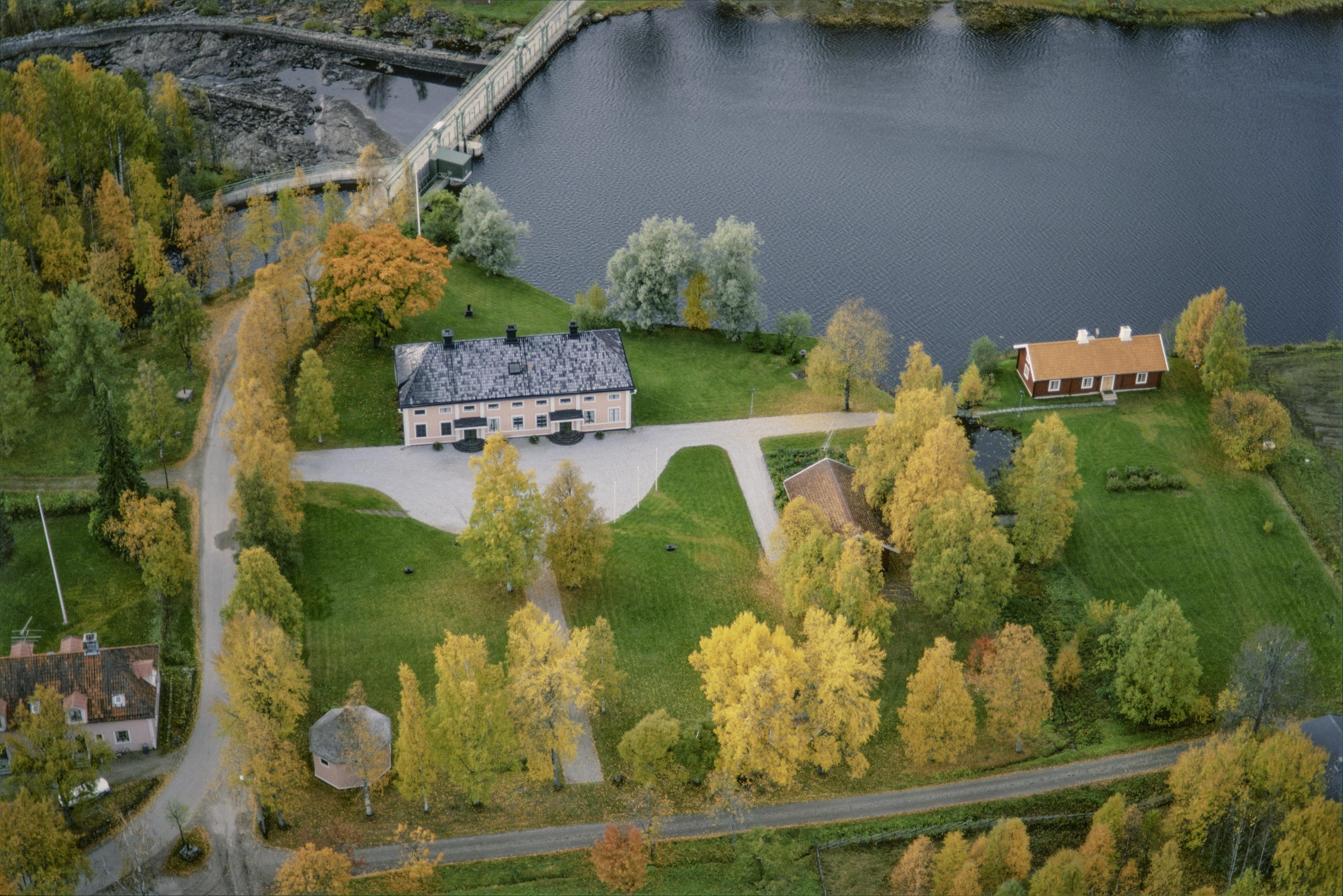 Beskrivning: Gideåbruk (skrivs även Gideå bruk) i Gideälven. Område med järnbrukslämningar RAÄnr Gideå 5:1. Vid bildens mitt Gideåbruks herrgård. Bilden är tagen mot (väderstreck): SSV