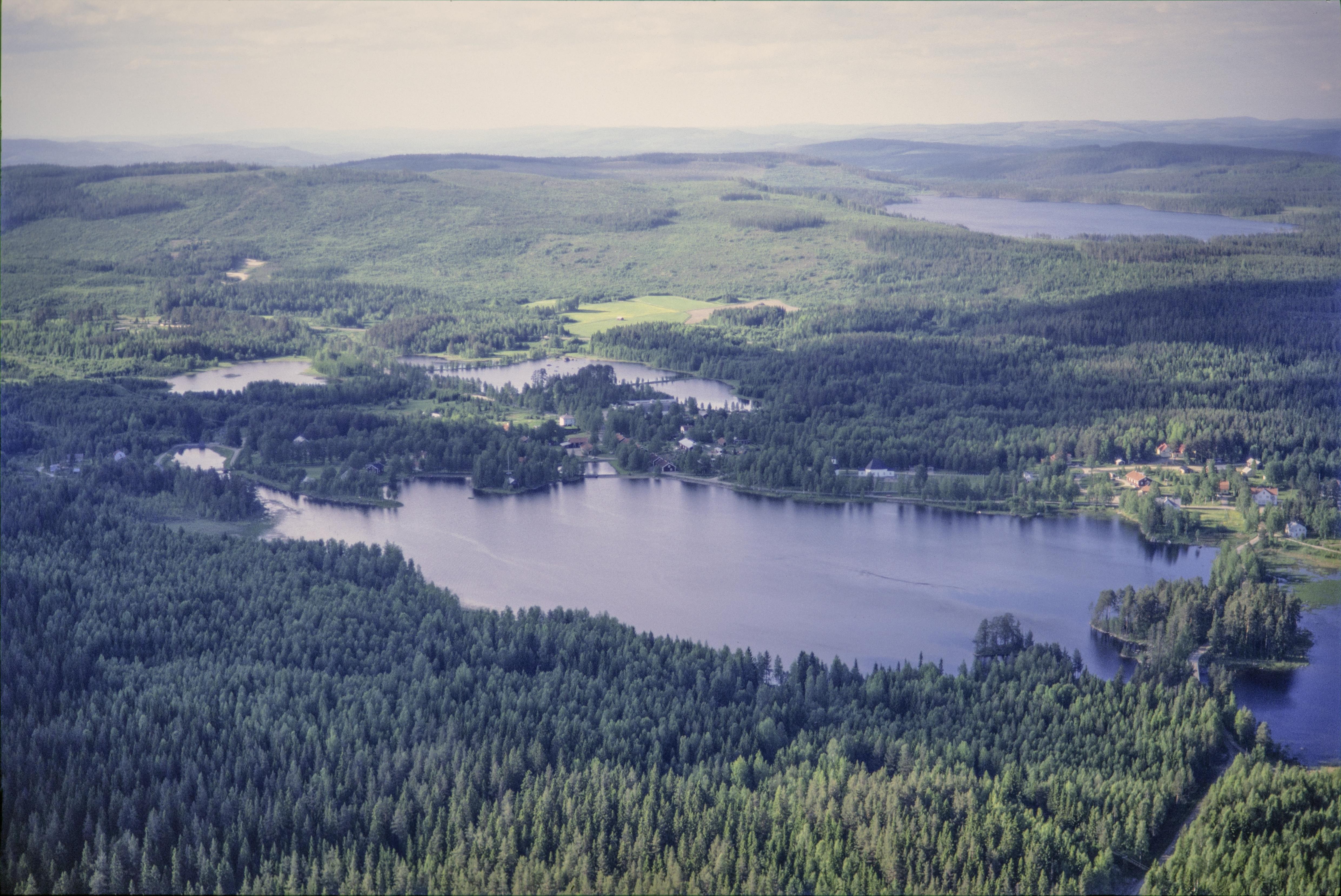 Beskrivning: Graninge bruk vid Bruksån och sjön Brukstjärnen. Hytt- och hammarområde RAÄnr Graninge 232:1-2. Graninge kyrka skymtas bland träden vid stranden i bildens mitt. Bilden är tagen mot (väderstreck): N