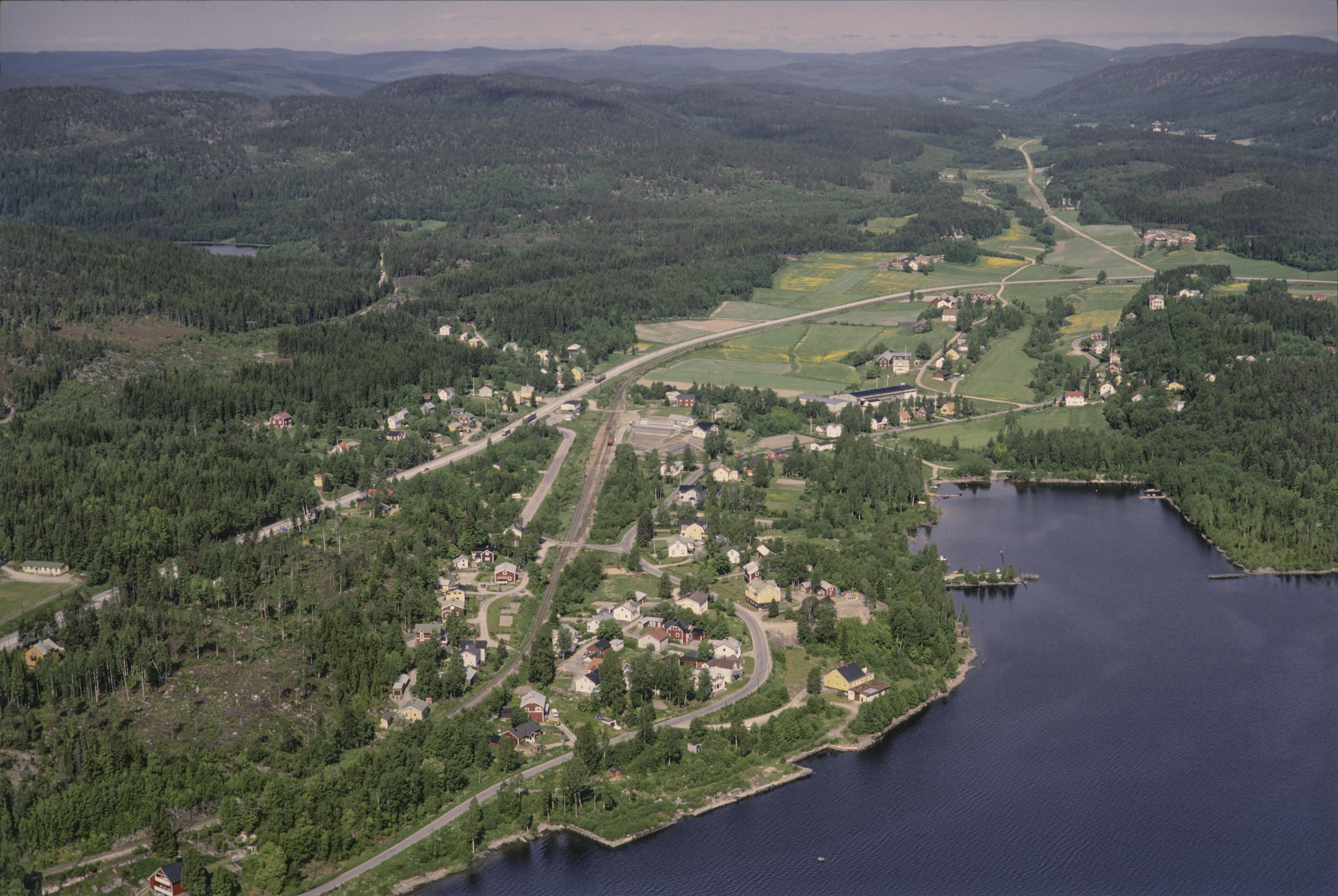 Beskrivning: Östbybäckens dalgång möter Ångermanälvens dalgång. Ramviks tätort och järnvägssamhälle vid Östbybäckens utlopp i Ångermanälven. Nere i bildens vänstra hörn fyndplats (pilspets av kvartsit) RAÄnr Högsjö 33:1. Bilden är tagen mot (väderstreck): NNV