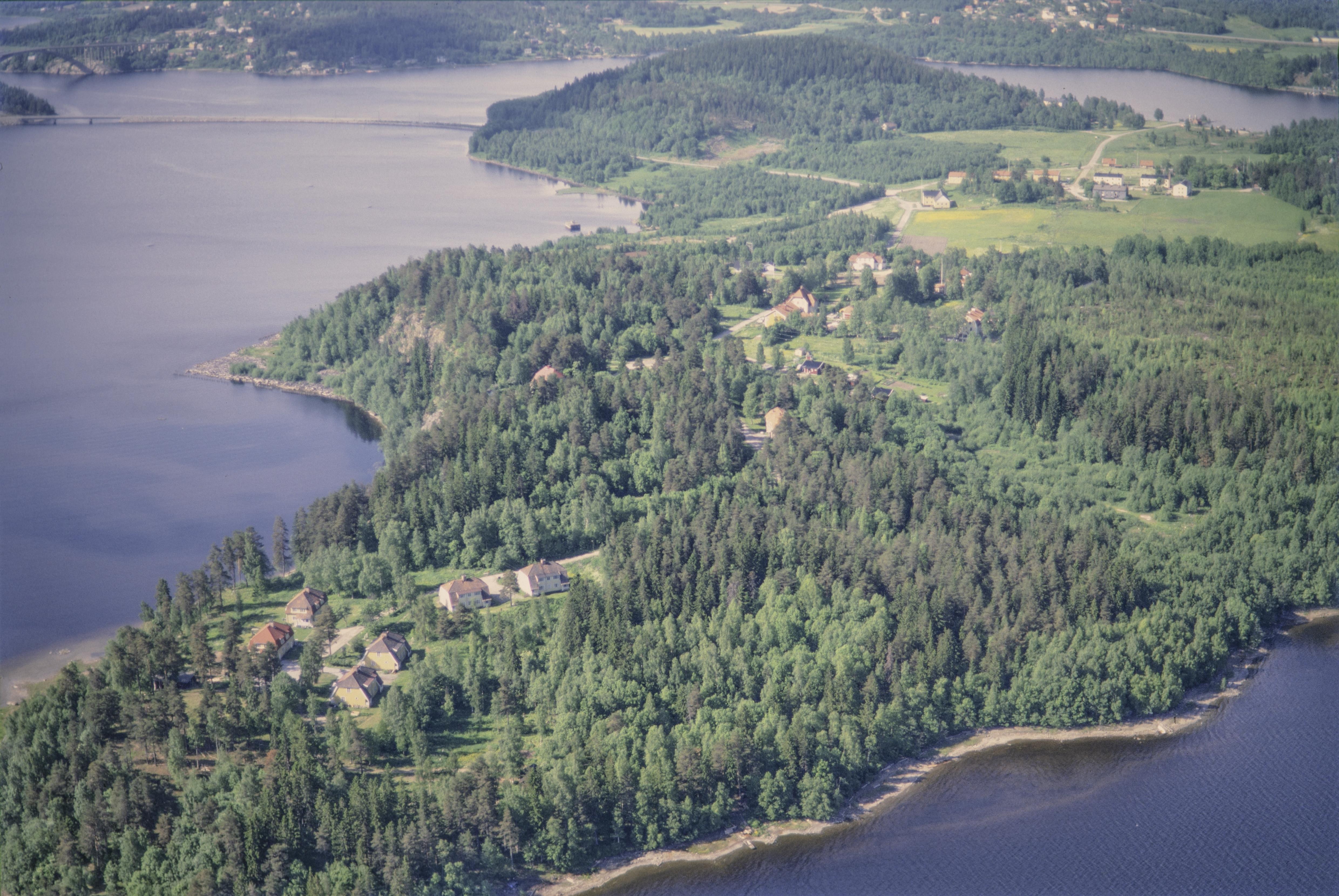 Beskrivning: Ön Svanön i Ångermanälvens dalgång. I och vid Svanö by (skrivs även Svanöbruk) finns byggnader och lämningar efter sågverk och sulfitfabrik, RAÄnr Kramfors 68:1. Korpberget i bildens nedre del. Bilden är tagen mot (väderstreck): SV