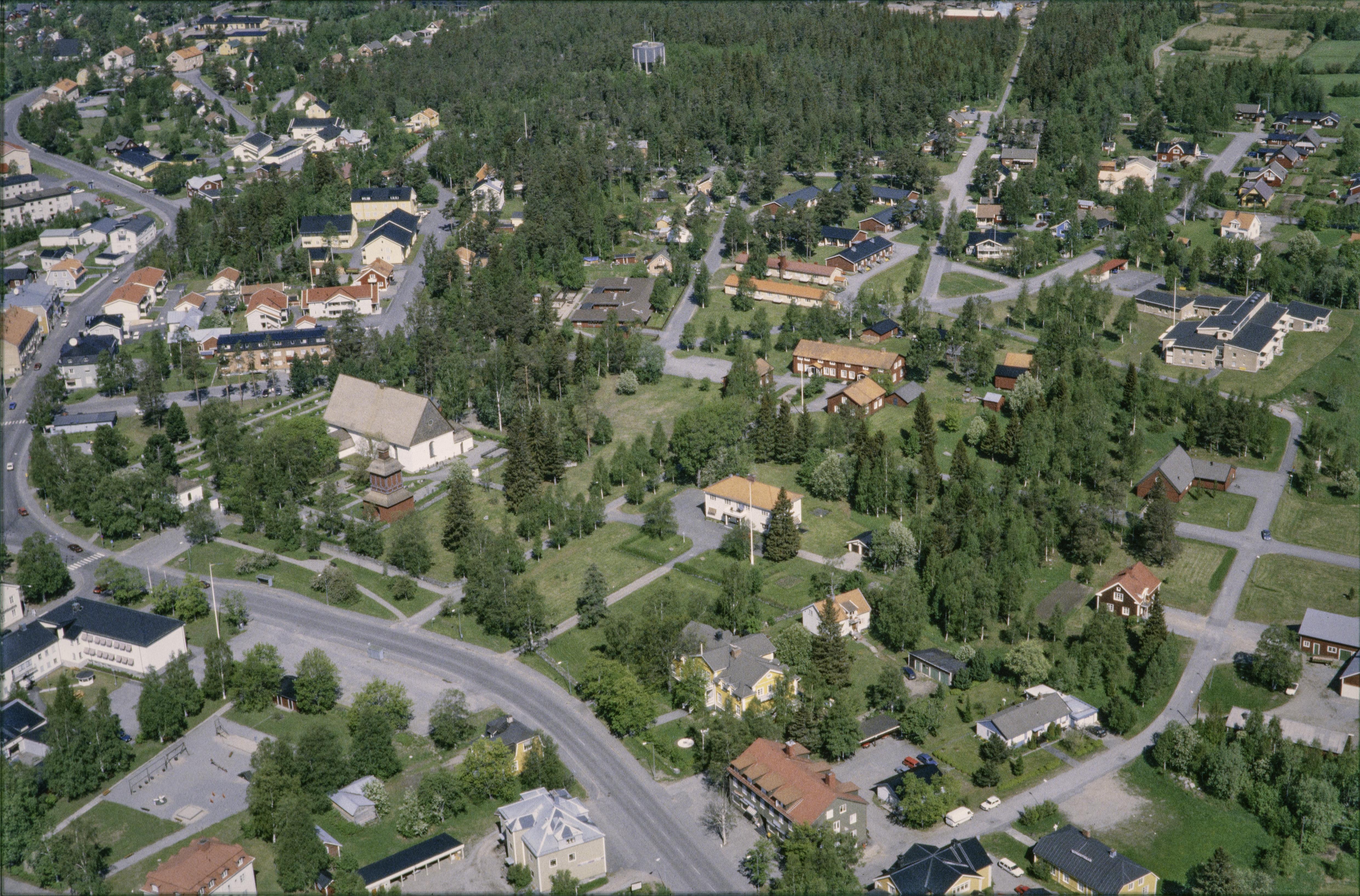 Beskrivning: Nordmalings tätort och kyrkby. Vid bildens mitt Nordmalings kyrka och prästgård i medeltida tomt RAÄnr Nordmaling 996. Bilden är tagen mot (väderstreck): NV