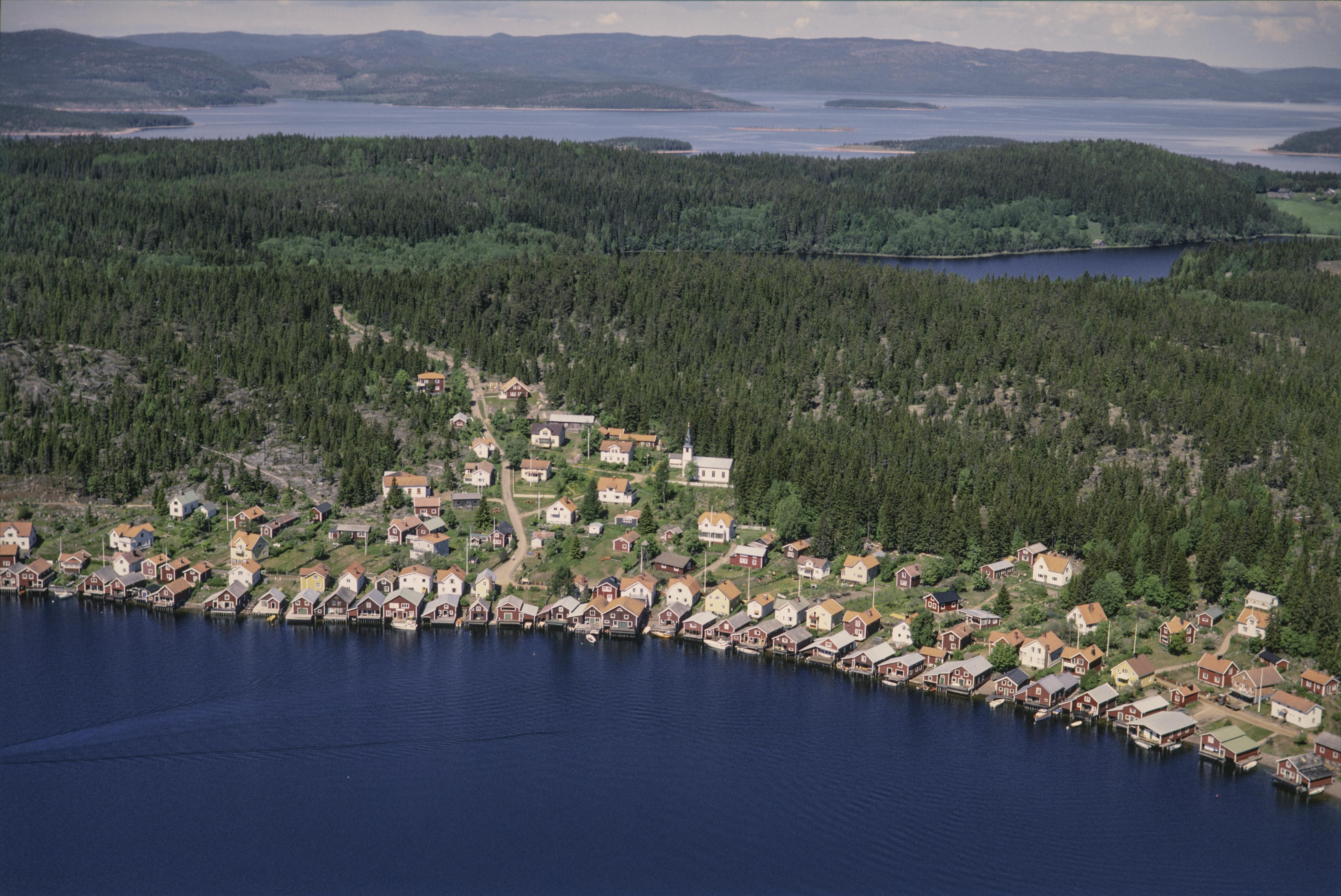 Beskrivning: Världsarvsområdet Höga kusten. Ulvöhamn fiskeläge och kyrkby på ön Norra Ulvön. Ulvö kyrka över bildens mitt. Vid vägen i fiskeläget minnesmärket RAÄnr Nätra 111:1. Bilden är tagen mot (väderstreck): NV