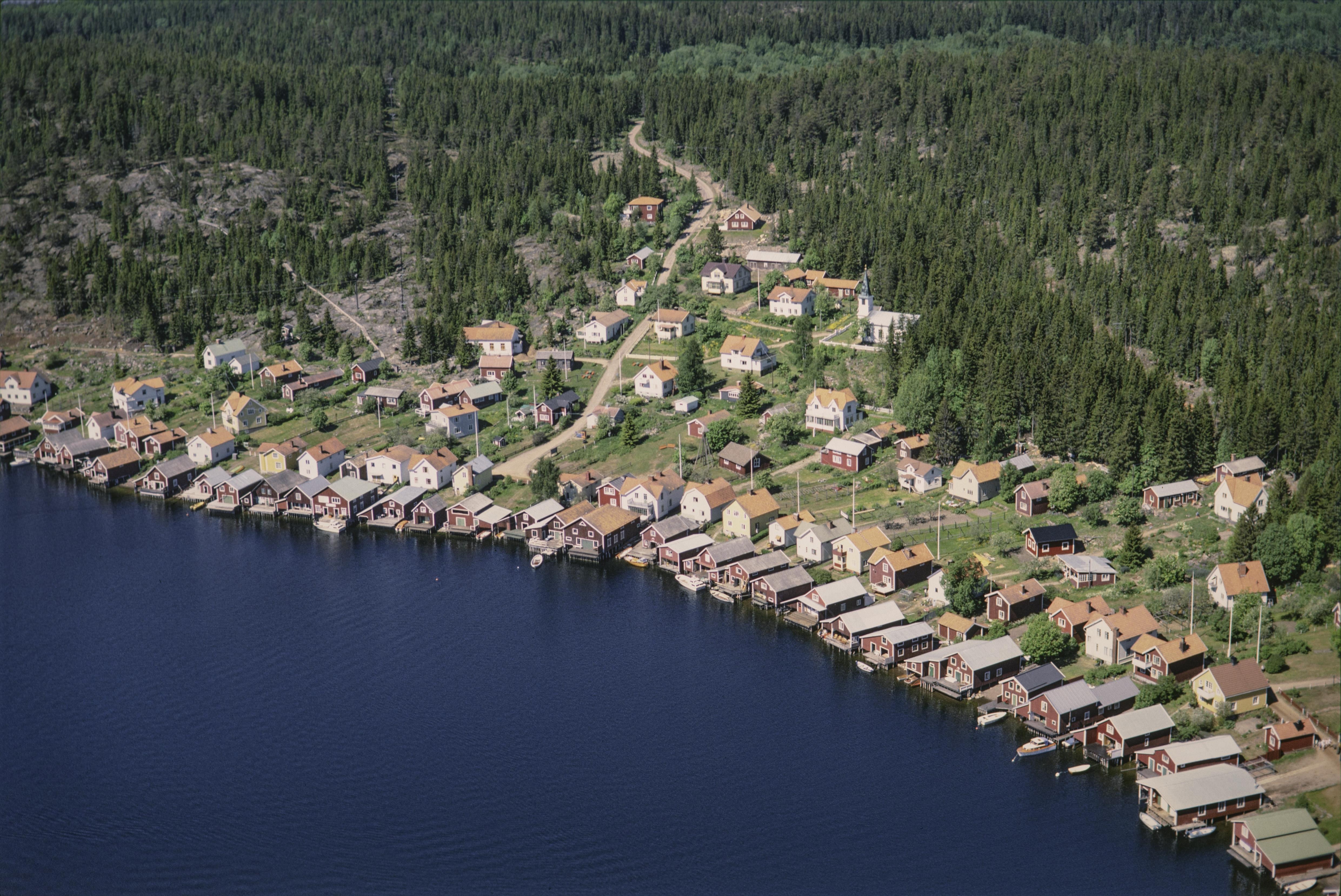 Beskrivning: Världsarvsområdet Höga kusten. Ulvöhamn fiskeläge och kyrkby på ön Norra Ulvön. Ulvö kyrka över bildens mitt. Vid vägen i fiskeläget minnesmärket RAÄnr Nätra 111:1. Bilden är tagen mot (väderstreck): VNV