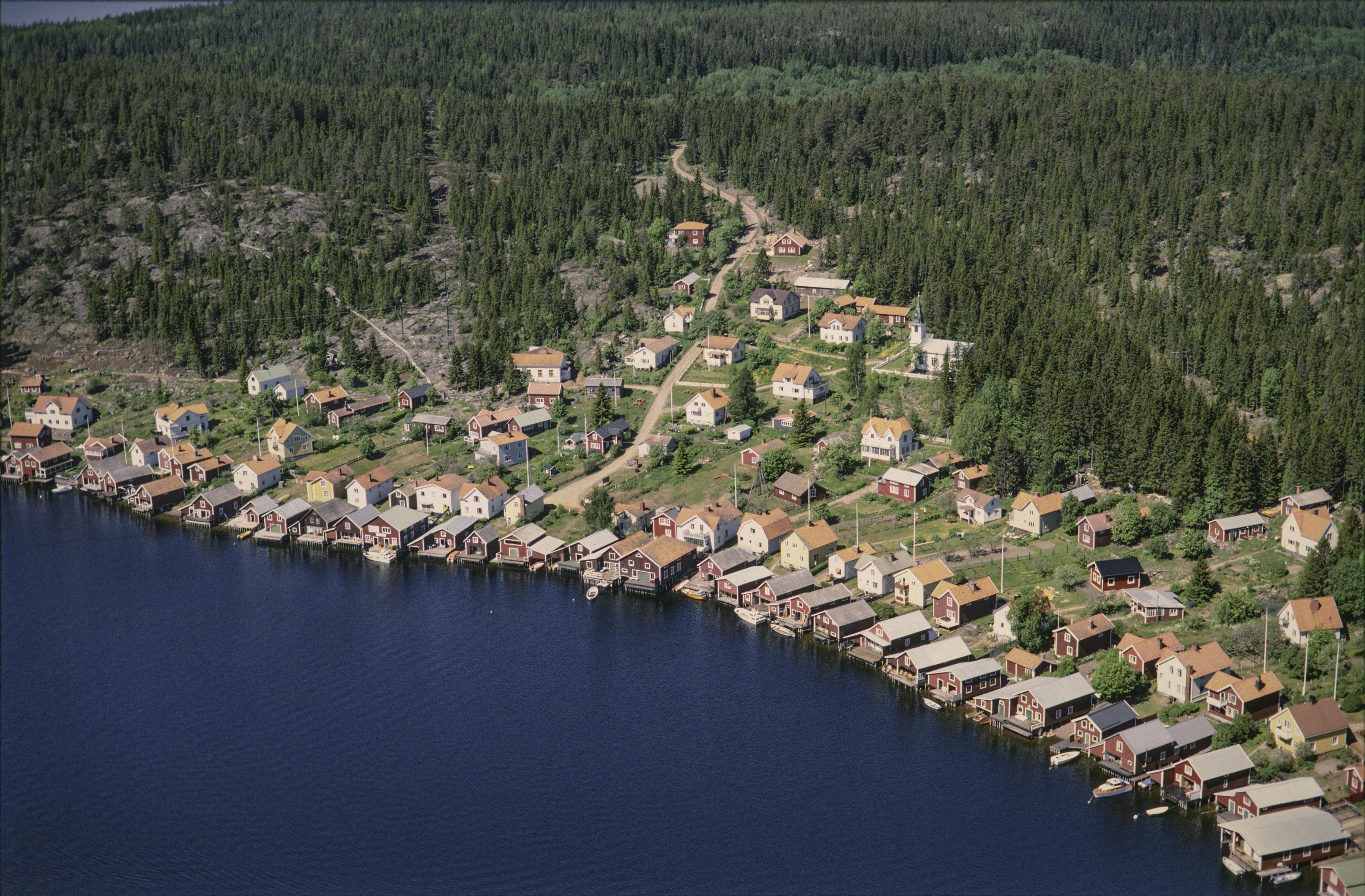 Beskrivning: Världsarvsområdet Höga kusten. Ulvöhamn fiskeläge och kyrkby på ön Norra Ulvön. Ulvö kyrka över bildens mitt. Vid vägen i fiskeläget minnesmärket RAÄnr Nätra 111:1. Bilden är tagen mot (väderstreck): VNV