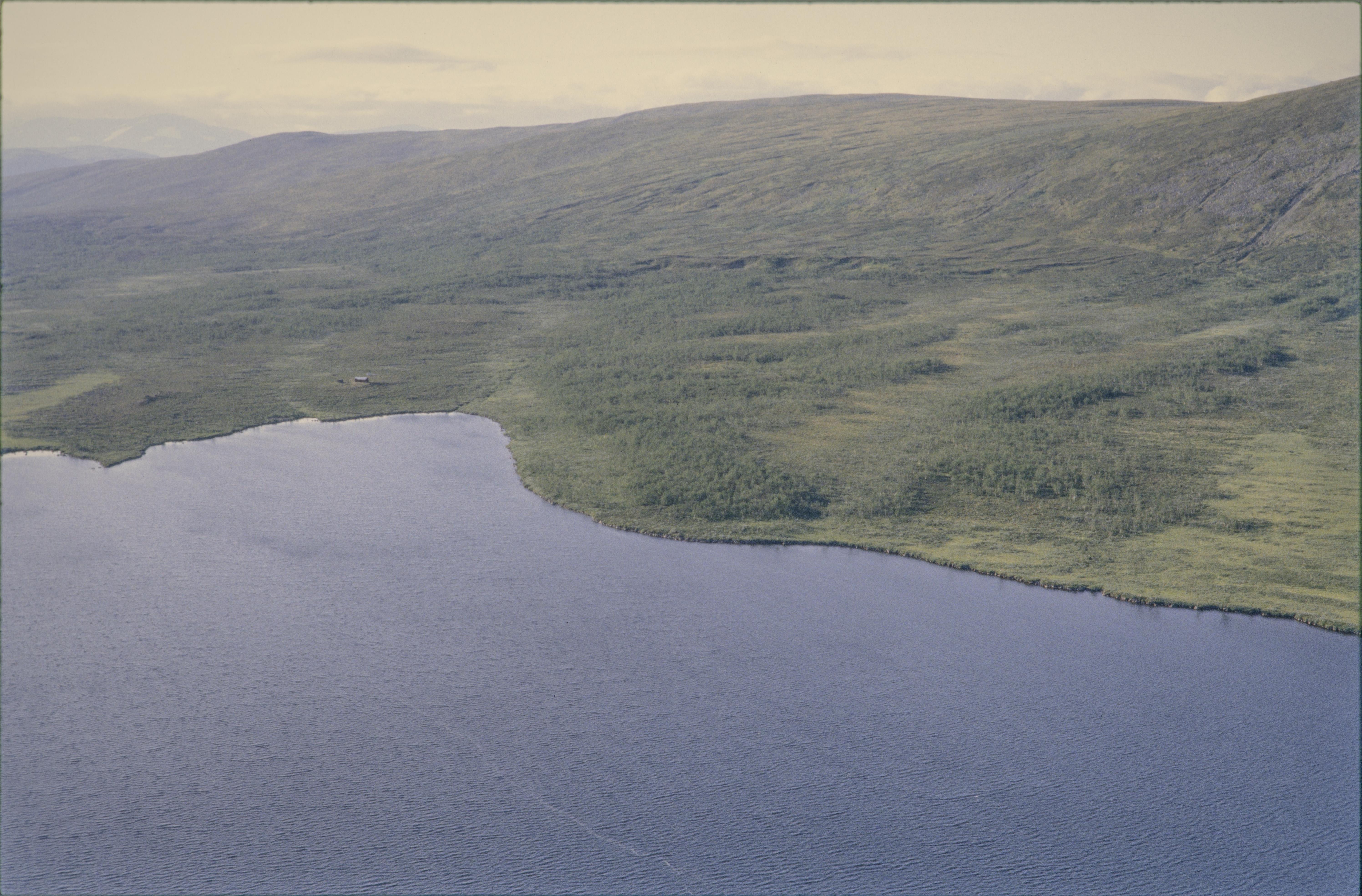 Beskrivning: Sjön Kiepanjaure (Giehpanjávri / Kiehpanjärvi). nordvästra ändan. Vid bildens mitt en renvaktarstuga. Till höger i bildens övre del berget Stuor Tuoipal. Bilden är tagen mot (väderstreck): N