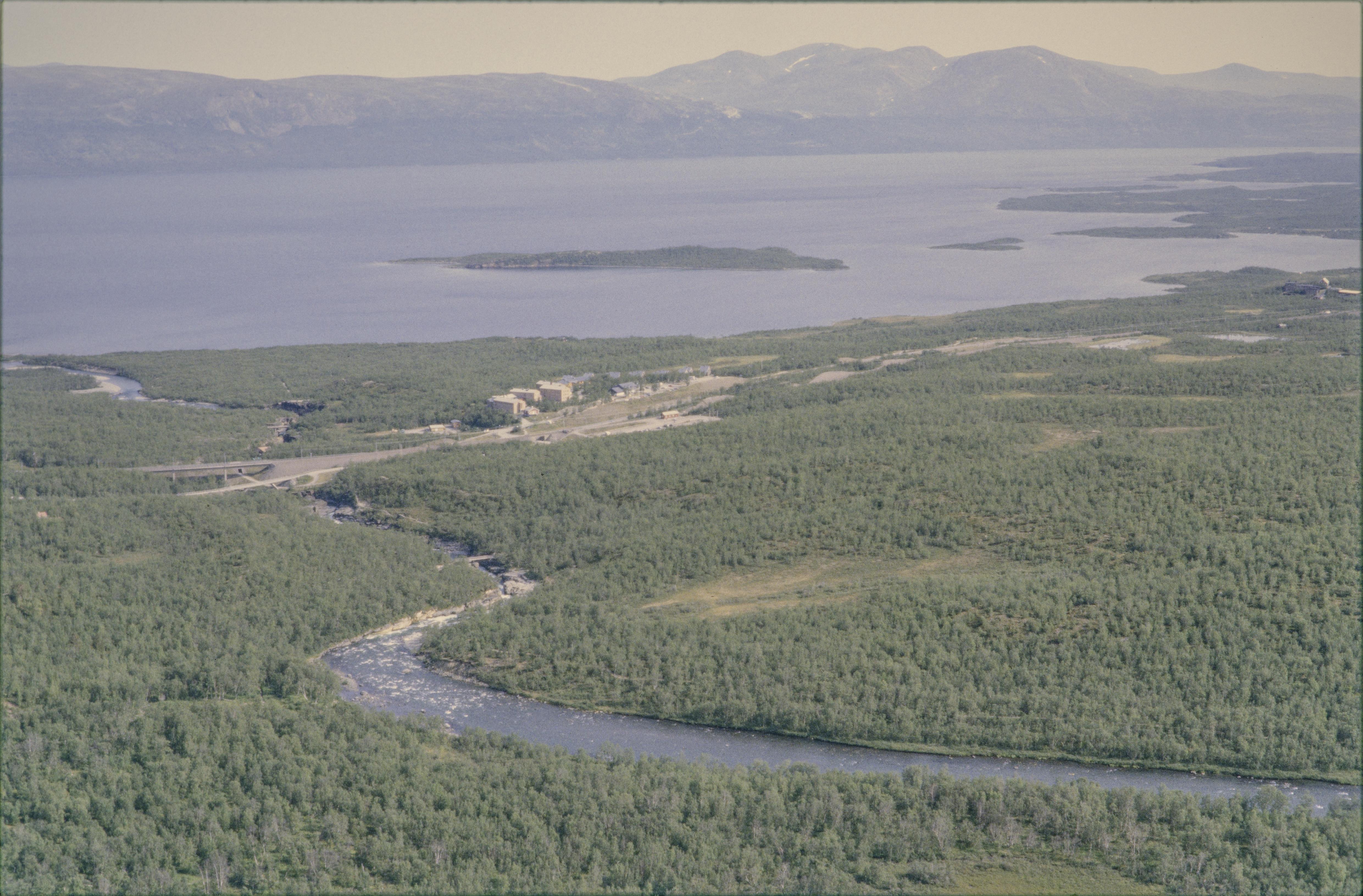 Beskrivning: Vid bildens mitt västra delen av orten Abisko (Ábeskovvu). I bildens nedre del ån Abiskojåkka (Ábeskoeatnu). Vid ån fångstgropar RAÄnr Jukkasjärvi 495:1-2 m.m. Över bildens mitt järnvägen Ofotbanen (Ofotbanan / Malmbanan) längs sjön Torneträsk. Området ingår i Abisko nationalpark. Bilden är tagen mot (väderstreck): NO