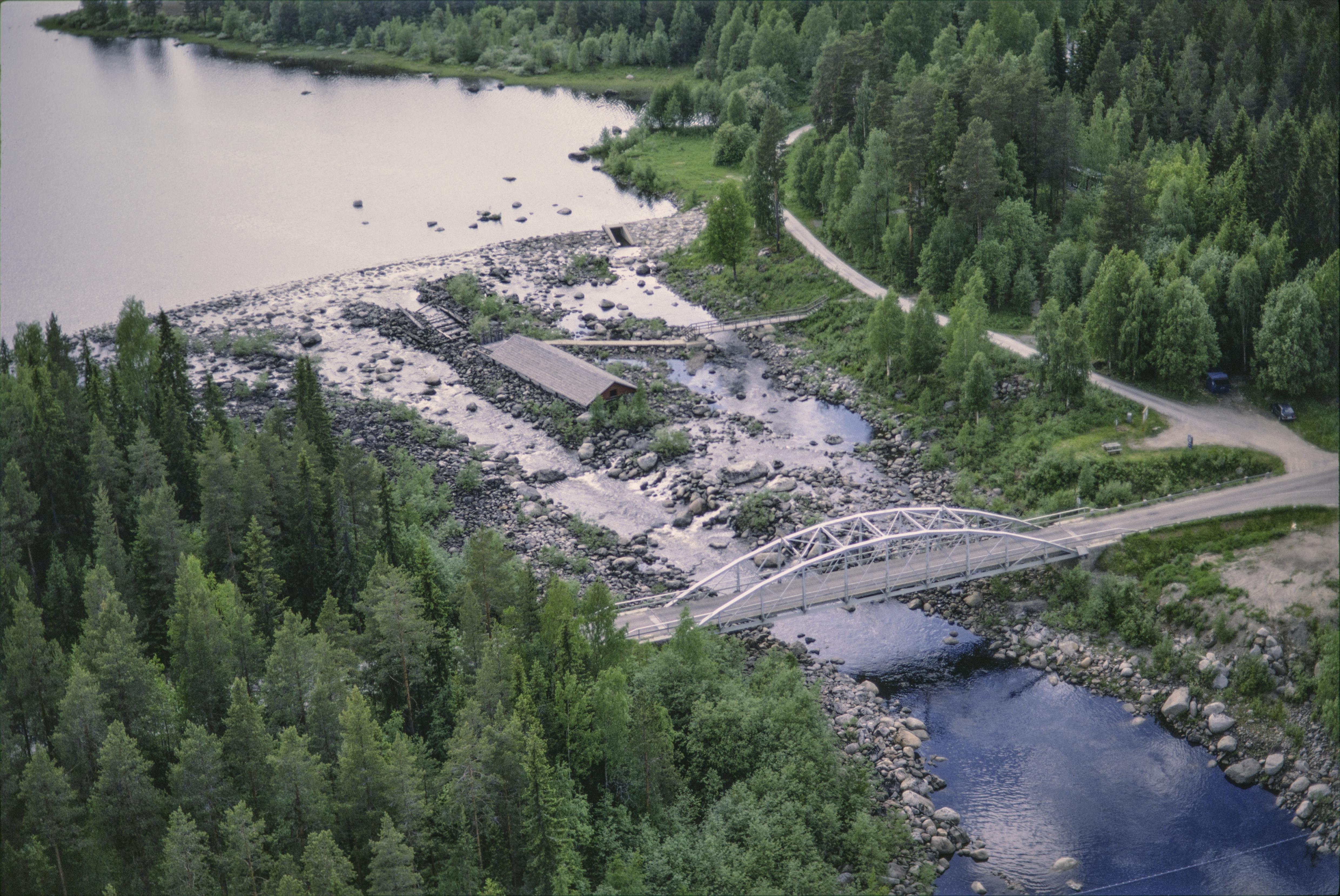 Beskrivning: Vägbro över ån Ljungan vid sjön Aldern, i området söder om Albybyn. Fiskhus i Ljungan över bildens mitt. Till vänster under bildens mitt fyndplats (slagg) RAÄnr Haverö 126:1. Bilden är tagen mot (väderstreck): VSV