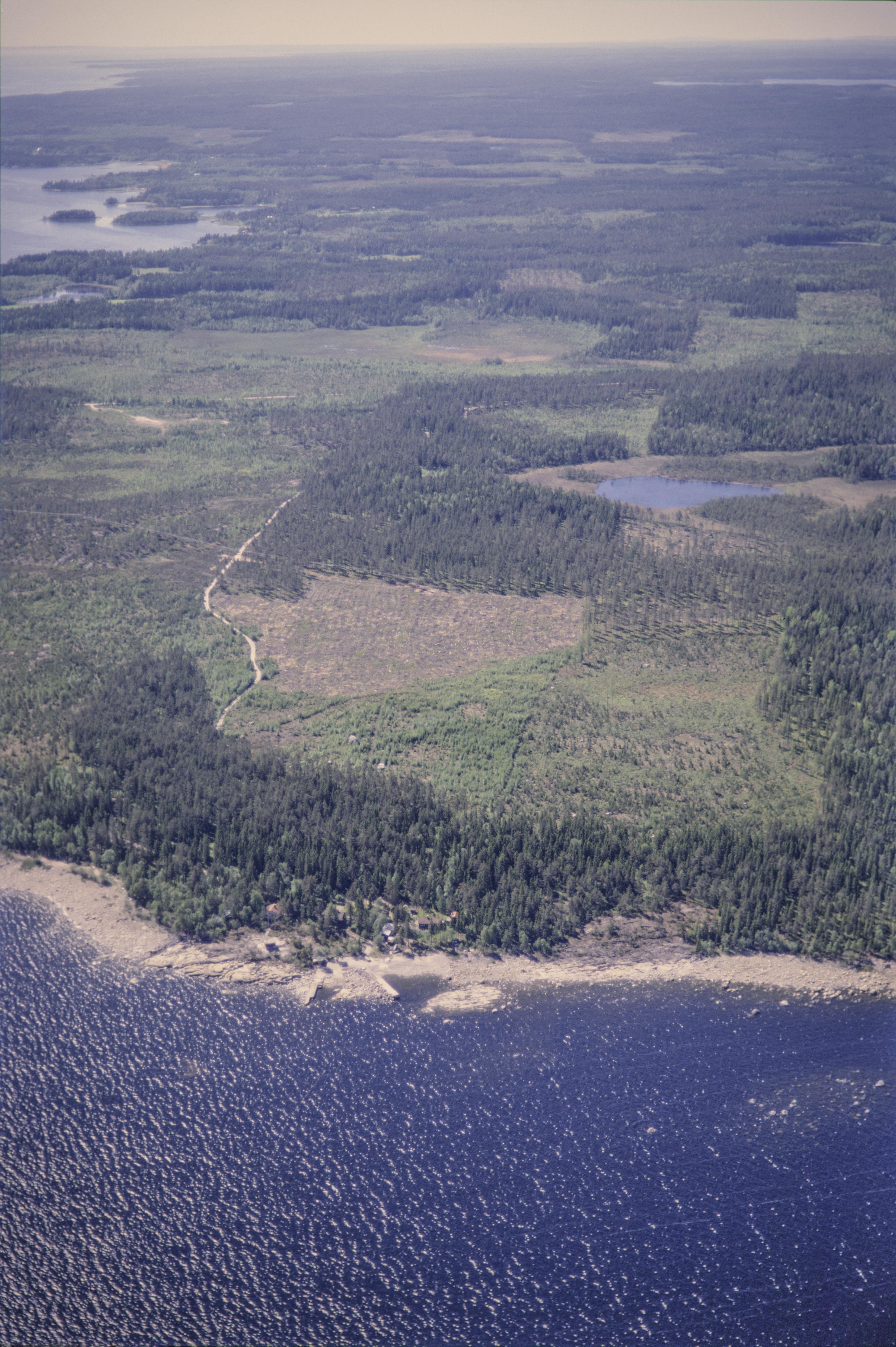 Beskrivning: Björkön, Njurundakusten. I bildens nedre del området mellan Bergaudd och Hälludden, öster om Bergafjärden. Under bildens mitt skogbrukslämningar RAÄnr Njurunda 1142 och 1150 vid Ässjötjärnen. Bilden är tagen mot (väderstreck): SSV