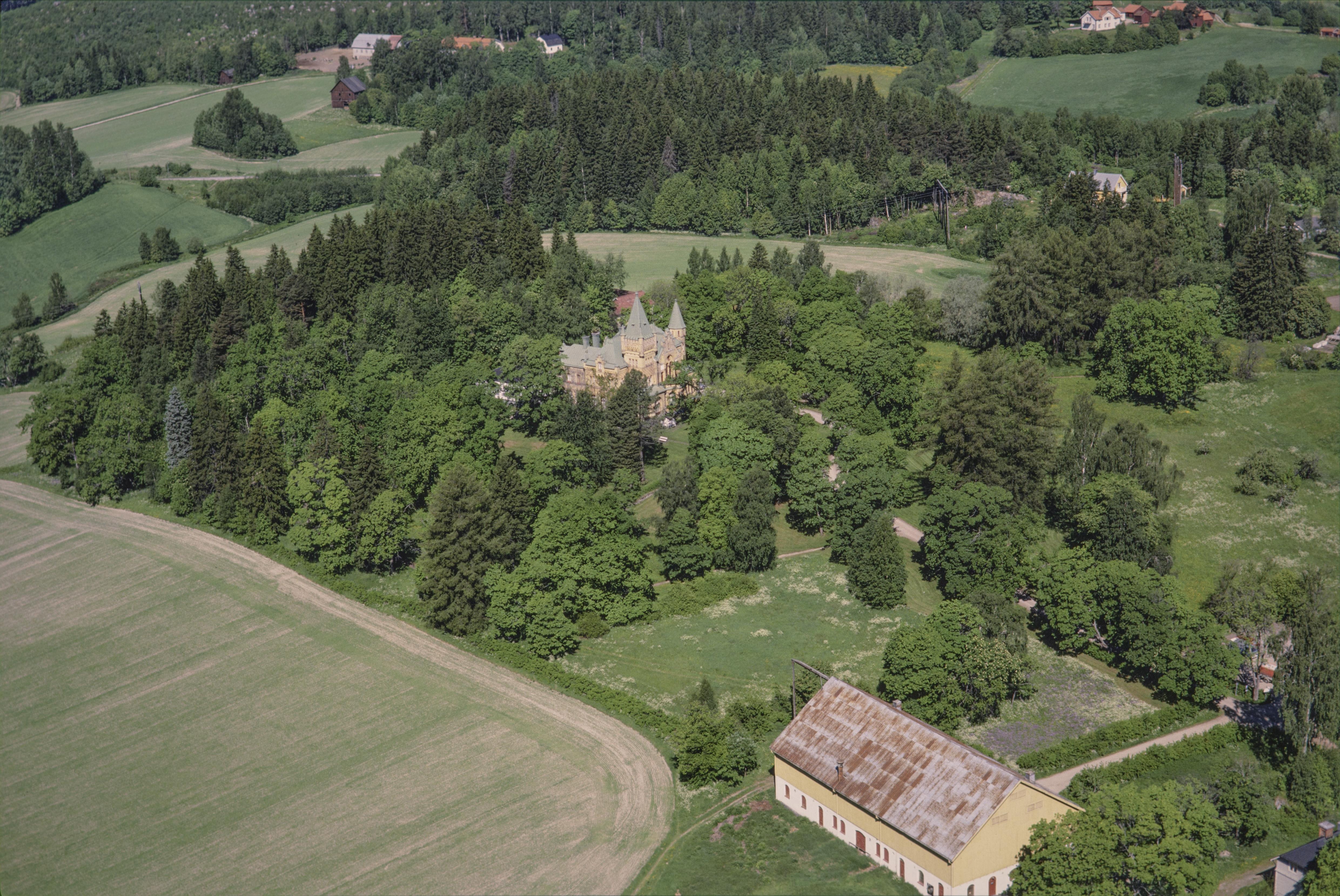 Beskrivning: Området Märlo i sydvästra delen av Timrå tätort. Vid bildens mitt sågverkspatronsboligen "Villa Merlo slott" RAÄnr Timrå 117:1. Bilden är tagen mot (väderstreck): NNV