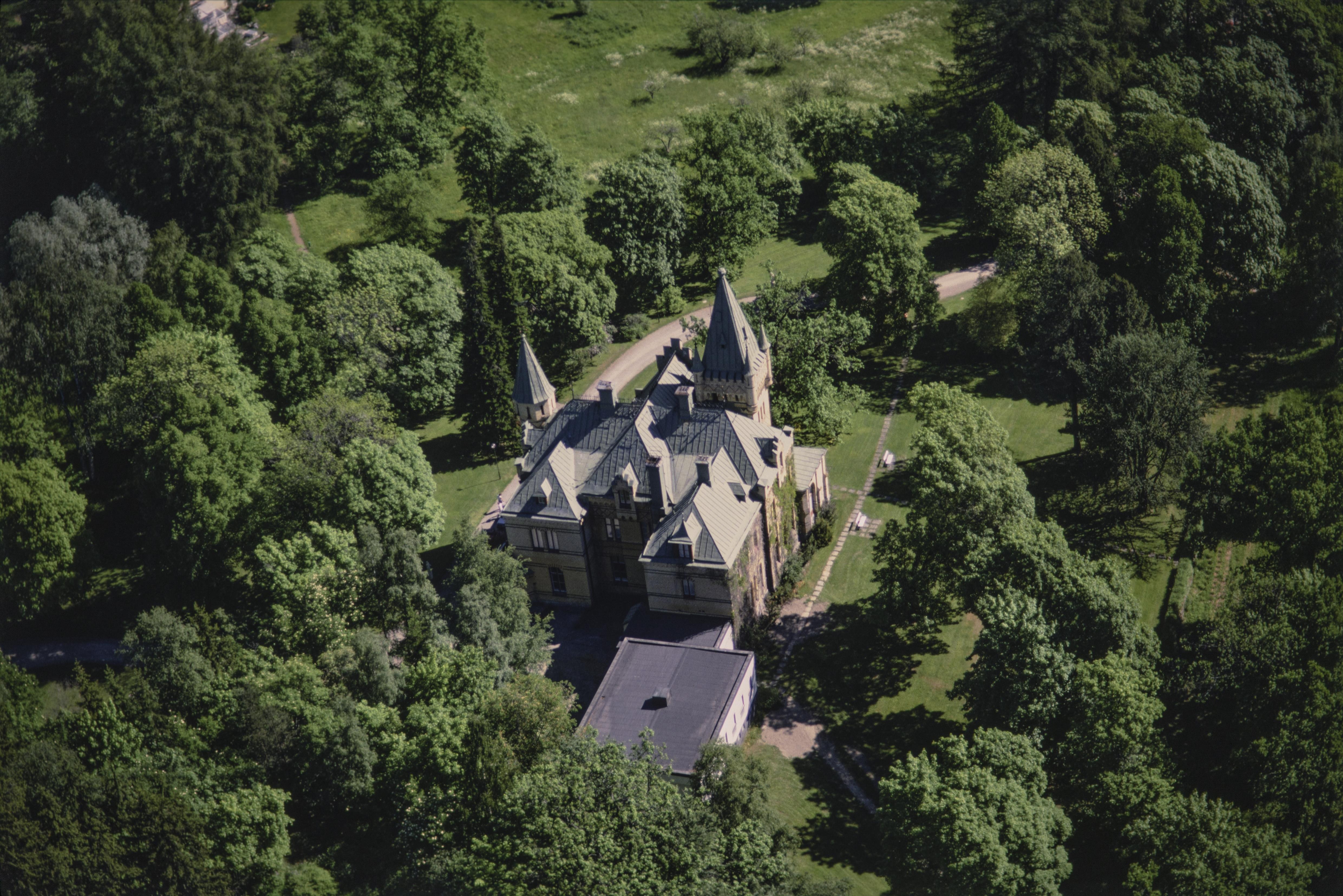 Beskrivning: Området Märlo i sydvästra delen av Timrå tätort. Sågverkspatronsboligen "Villa Merlo slott" RAÄnr Timrå 117:1. Bilden är tagen mot (väderstreck): NO