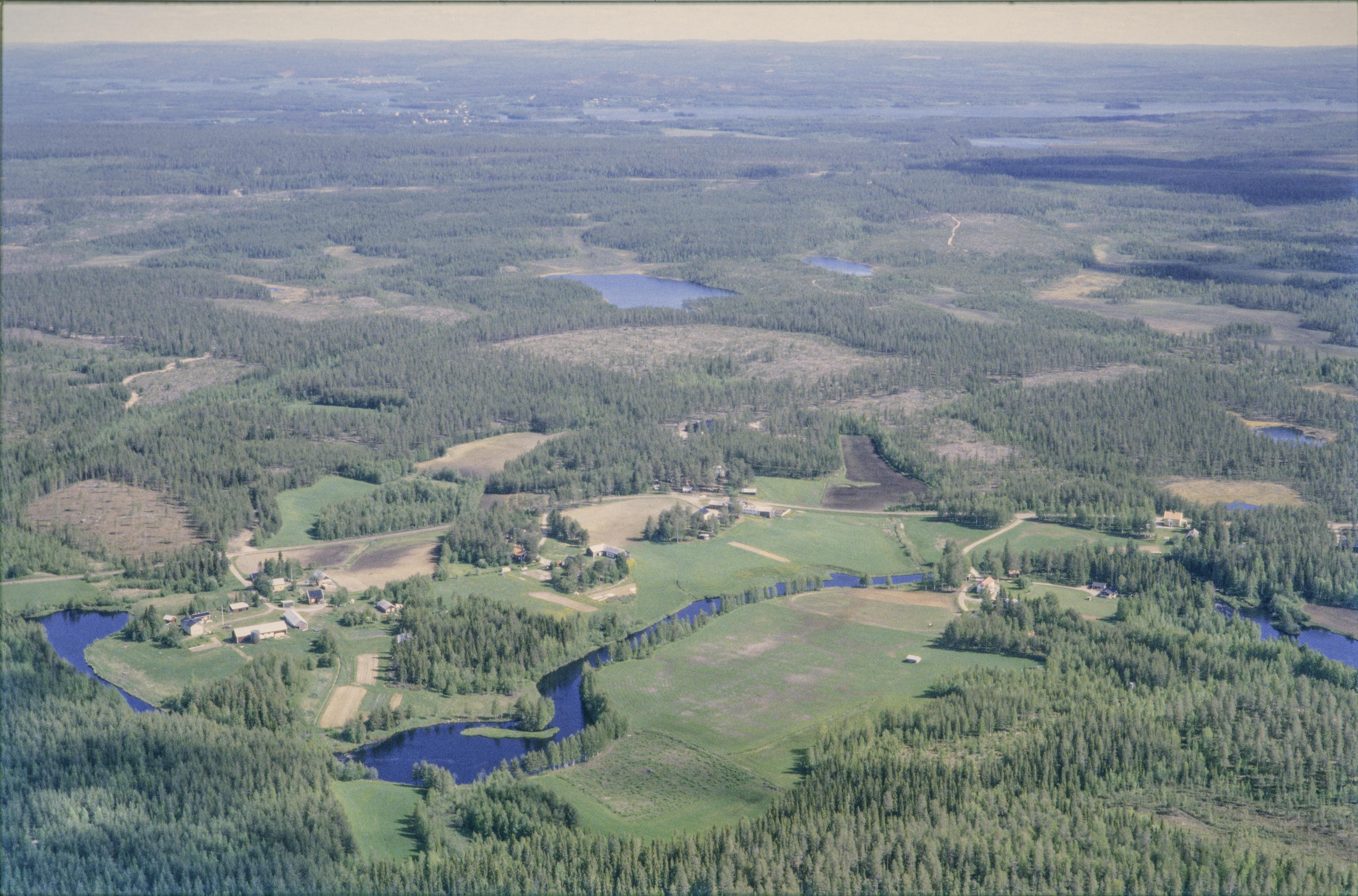 Beskrivning: Byn Långsel vid Töreälven. Nere till vänster tjärdal / tjärgrop RAÄnr Töre 293:1. Vid bildens mitt boplatsgrop RAÄnr Töre 391:1, 408:1, 411:1. m.m. vid Stortjärnen och Mossarottjärnen. Till höger om bildens mitt Fattenborgs naturreservat. Bilden är tagen mot (väderstreck): NO