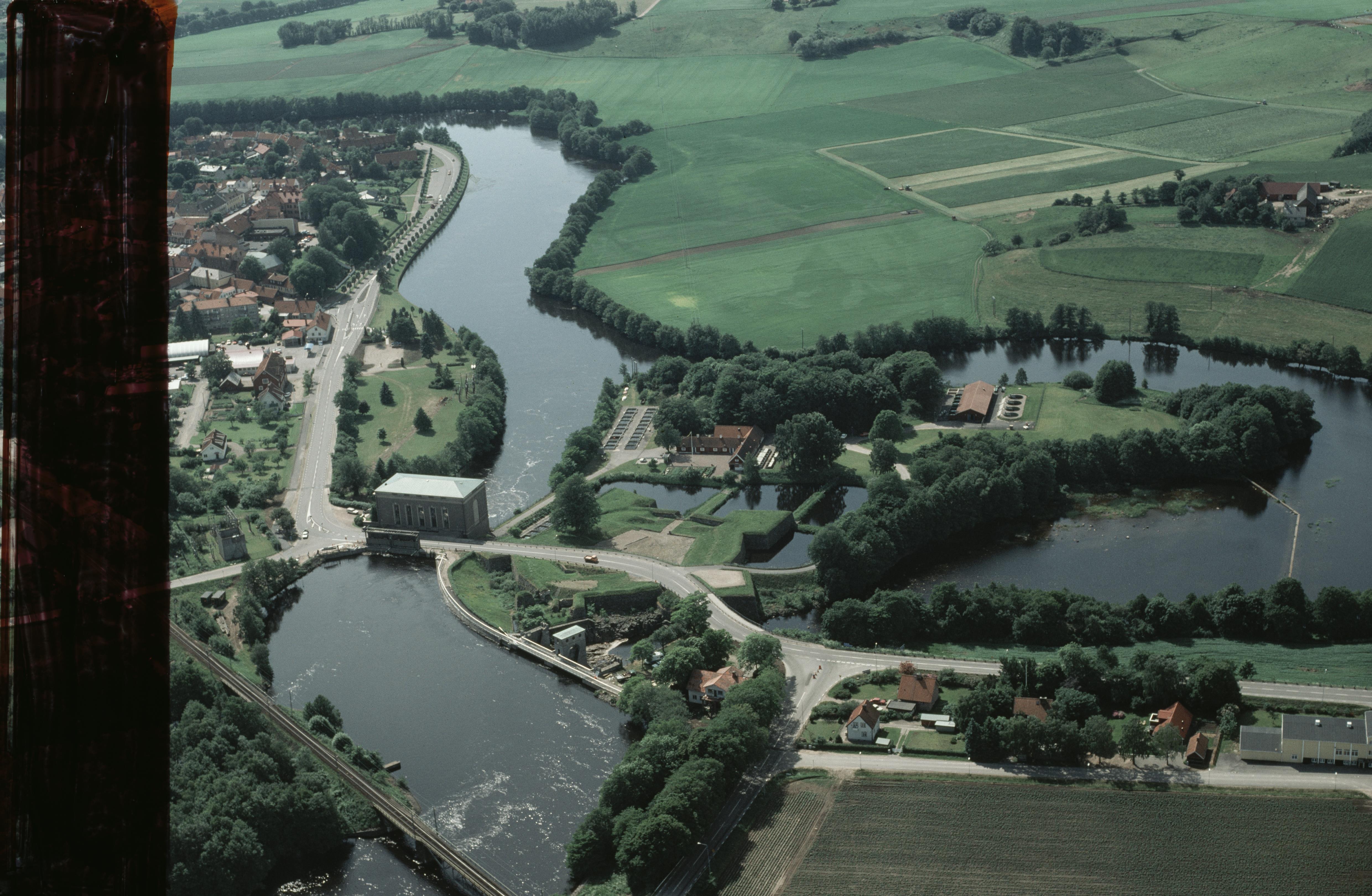 Beskrivning: Laholms stad med Lagaholm. Lämningar efter fästning RAÄnr Laholm 38:1 på Skansholmen i ån Lagan. Laholms kraftverk till vänster under bildens mitt. Bilden är tagen mot (väderstreck): V