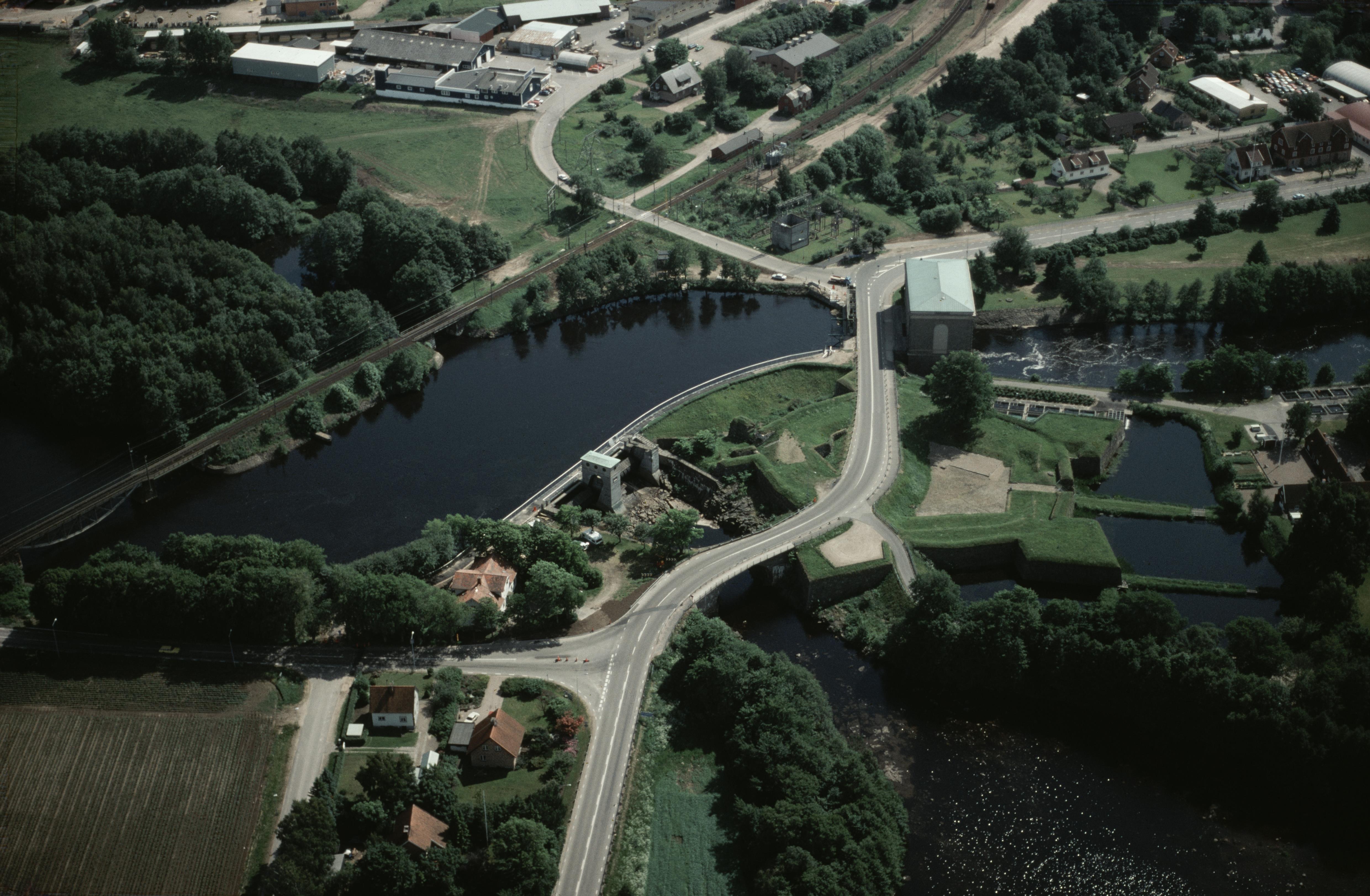 Beskrivning: Laholms stad med Lagaholm. Lämningar efter fästning RAÄnr Laholm 38:1 på Skansholmen i ån Lagan. Laholms kraftverk uppe till höger. Bilden är tagen mot (väderstreck): SSV