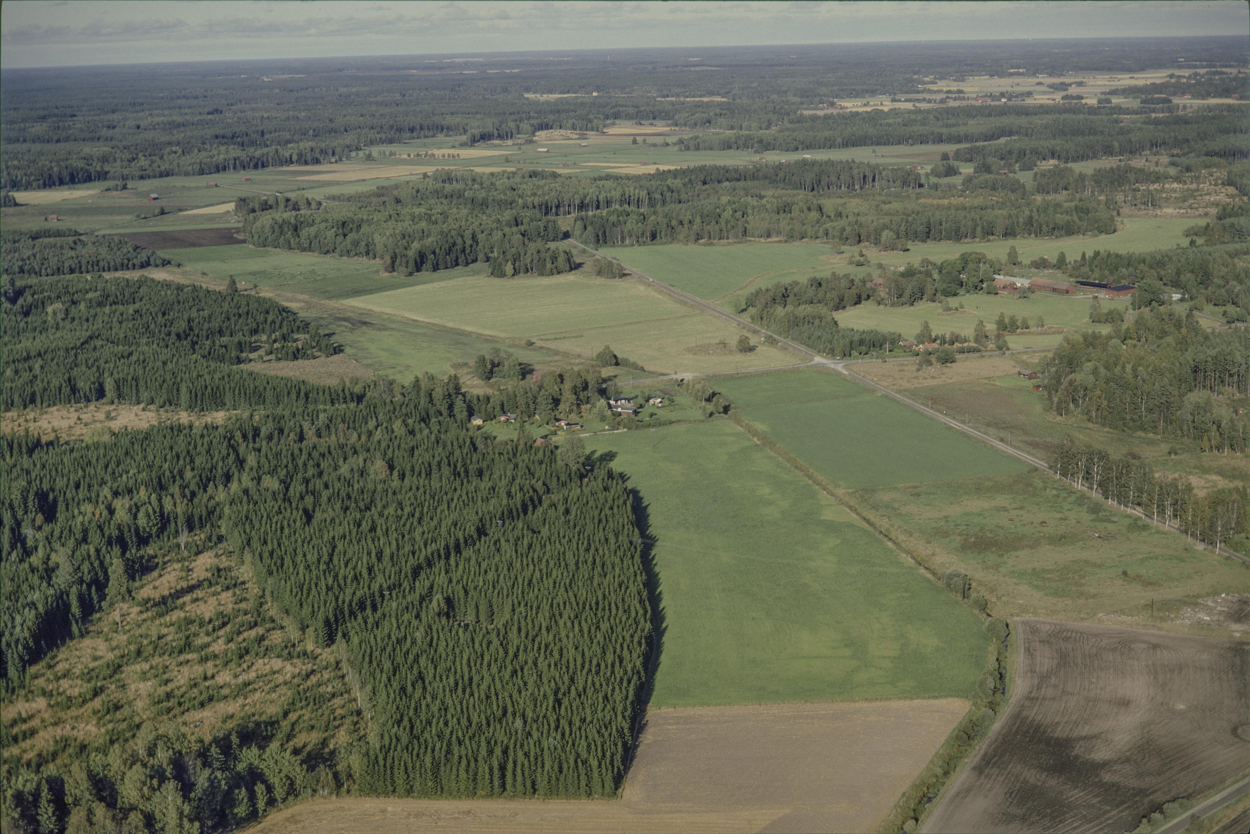 Beskrivning: Björklingeåns dalgång. Vid bildens mitt Vadängen sydväst om Broddbo by. Boplats RAÄnr Skuttunge 137:1. Bilden är tagen mot (väderstreck): NO