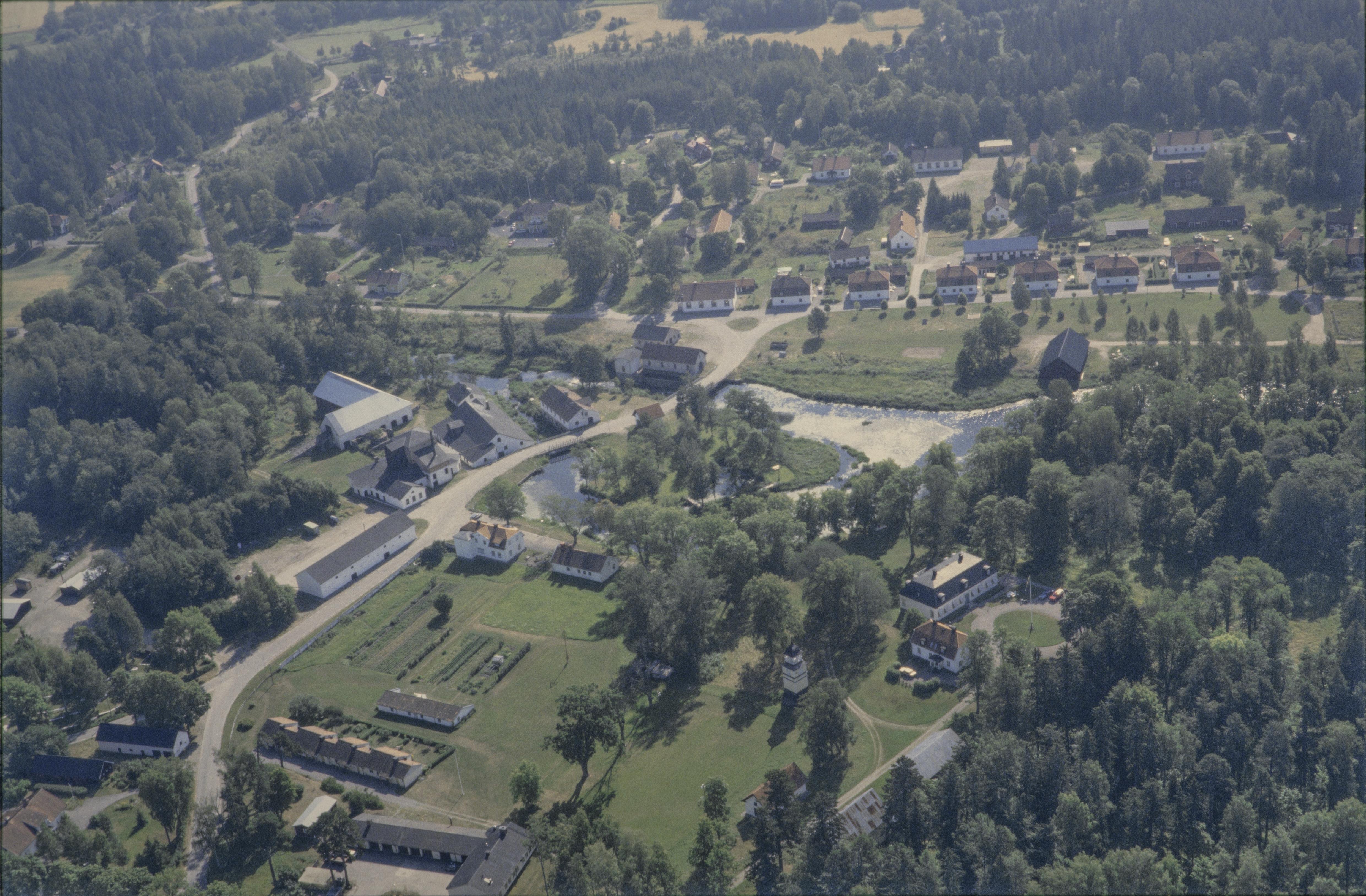 Beskrivning: Strömsbergs bruk vid Tämnarån. I bildens nedre del Strömsbergs parkanläggning RAÄnr Tolfta 198 vid Strömsbergs bruksherrgård. Bilden är tagen mot (väderstreck): Ö