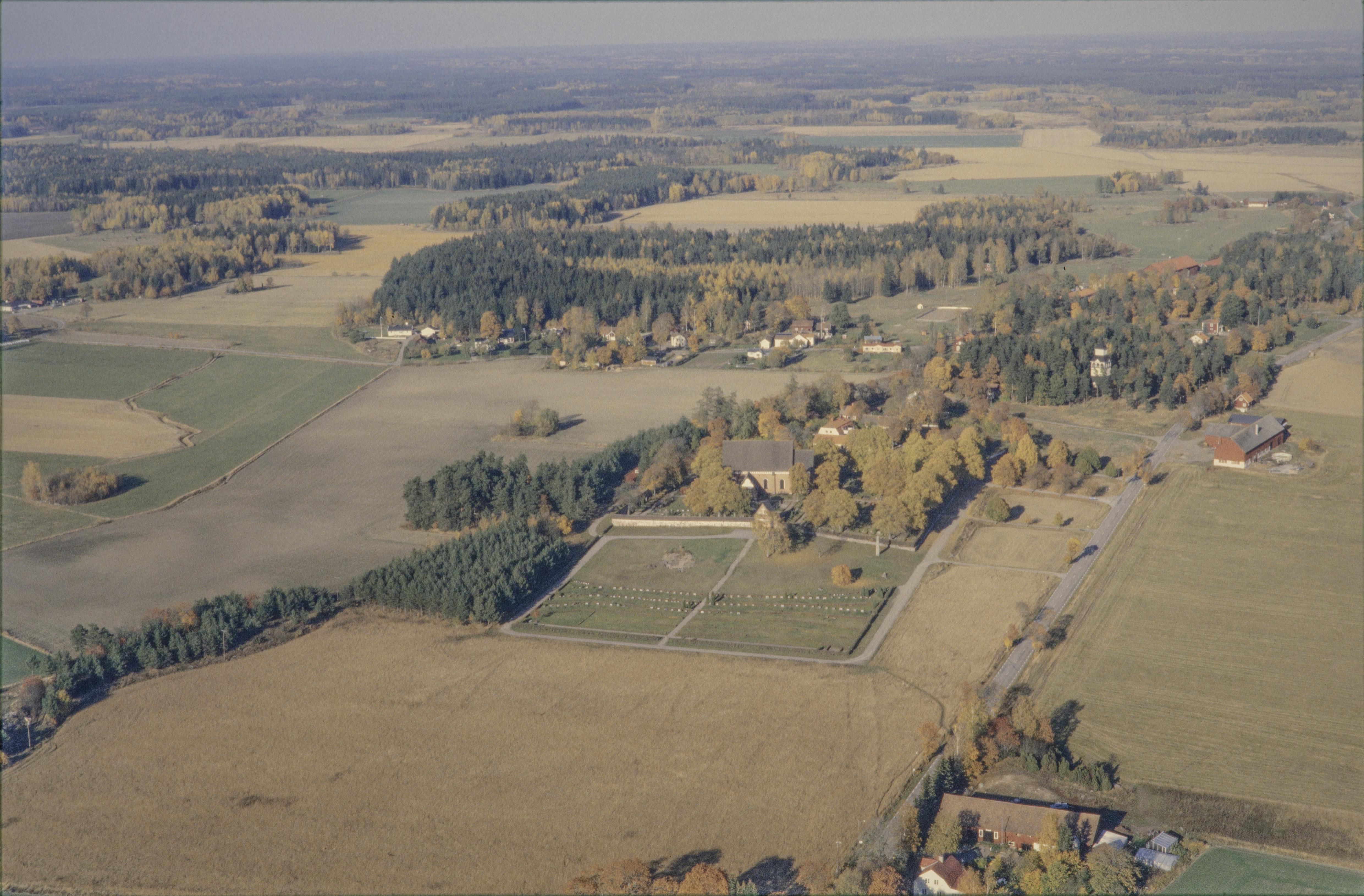 Beskrivning: Vid bildens mitt Vendels kyrka och Vendels prästgård. Till vänster under bildens mitt gravfält RAÄnr Vendel 27:1. Till höger om bildens mitt minnesmärke och båtgravfält RAÄnr Vendel 9:1-2. Bilden är tagen mot (väderstreck): N