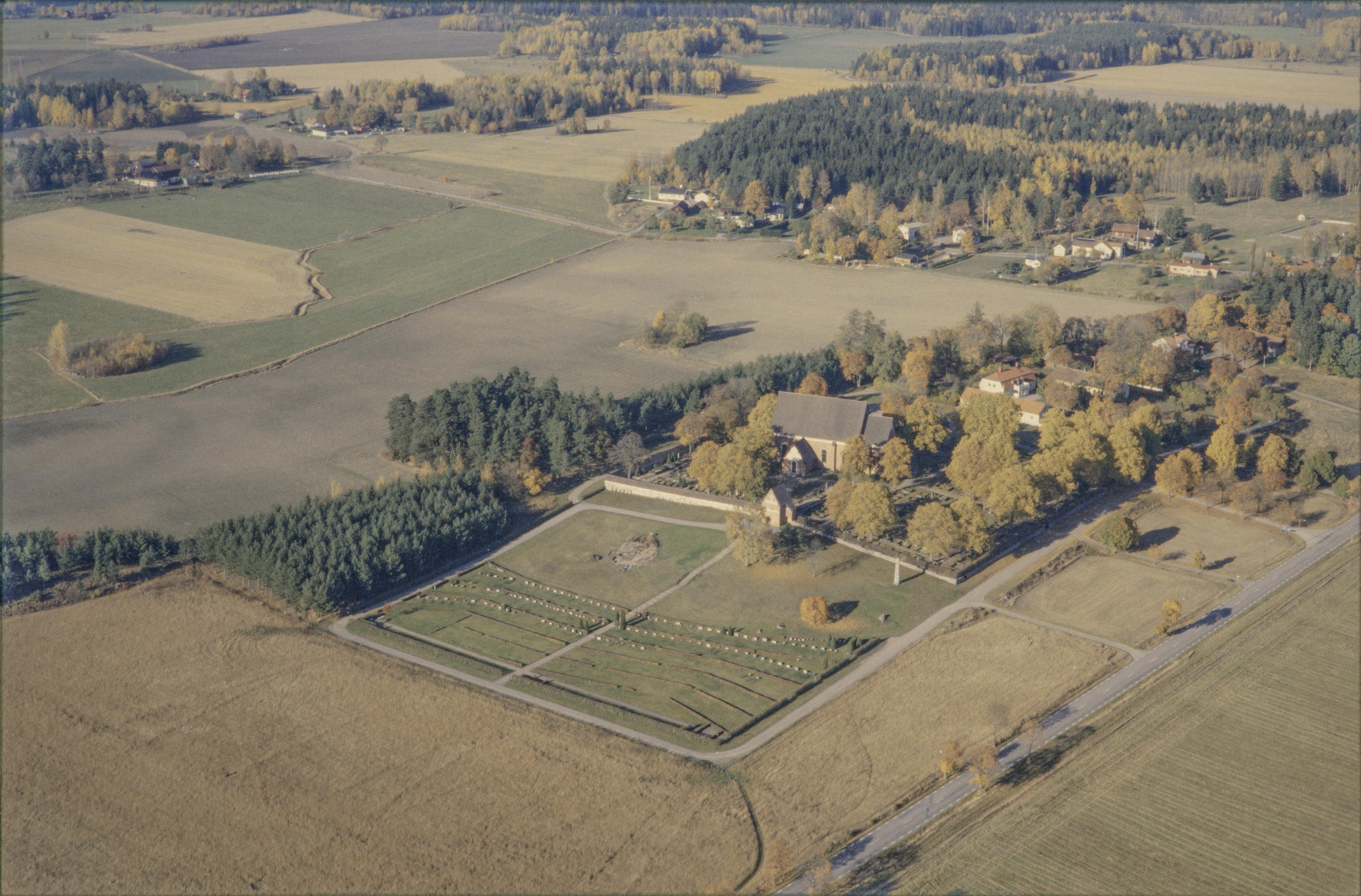 Beskrivning: Vid bildens mitt Vendels kyrka och prästgård. Under bildens mitt minnesmärke och båtgravfält RAÄnr Vendel 9:1-2. Holvarbo by m.fl. i bildens övre del. Bilden är tagen mot (väderstreck): N