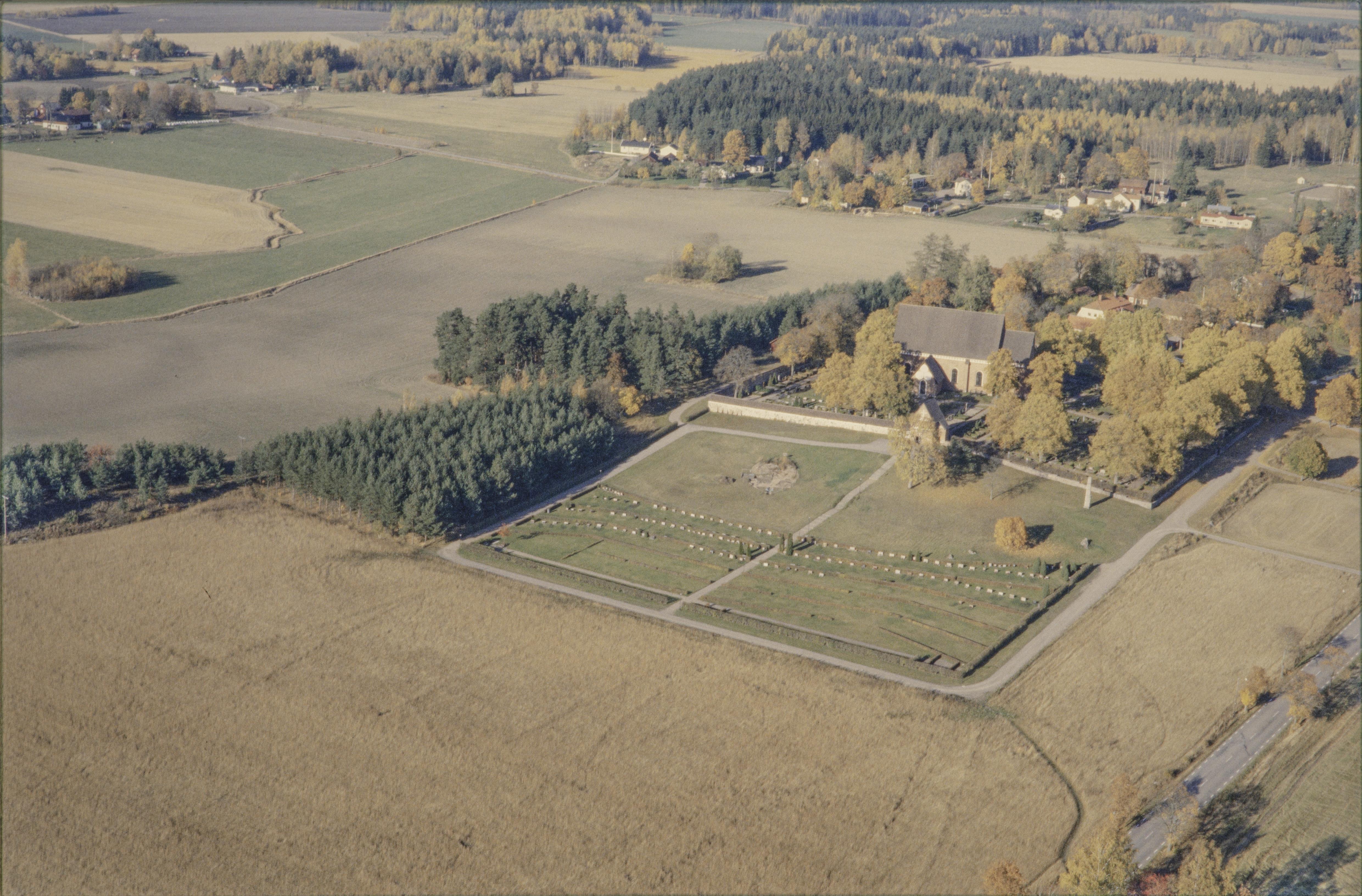 Beskrivning: Vid bildens mitt Vendels kyrka och prästgård. Under bildens mitt minnesmärke och båtgravfält RAÄnr Vendel 9:1-2. Holvarbo by m.fl. i bildens övre del. Bilden är tagen mot (väderstreck): N