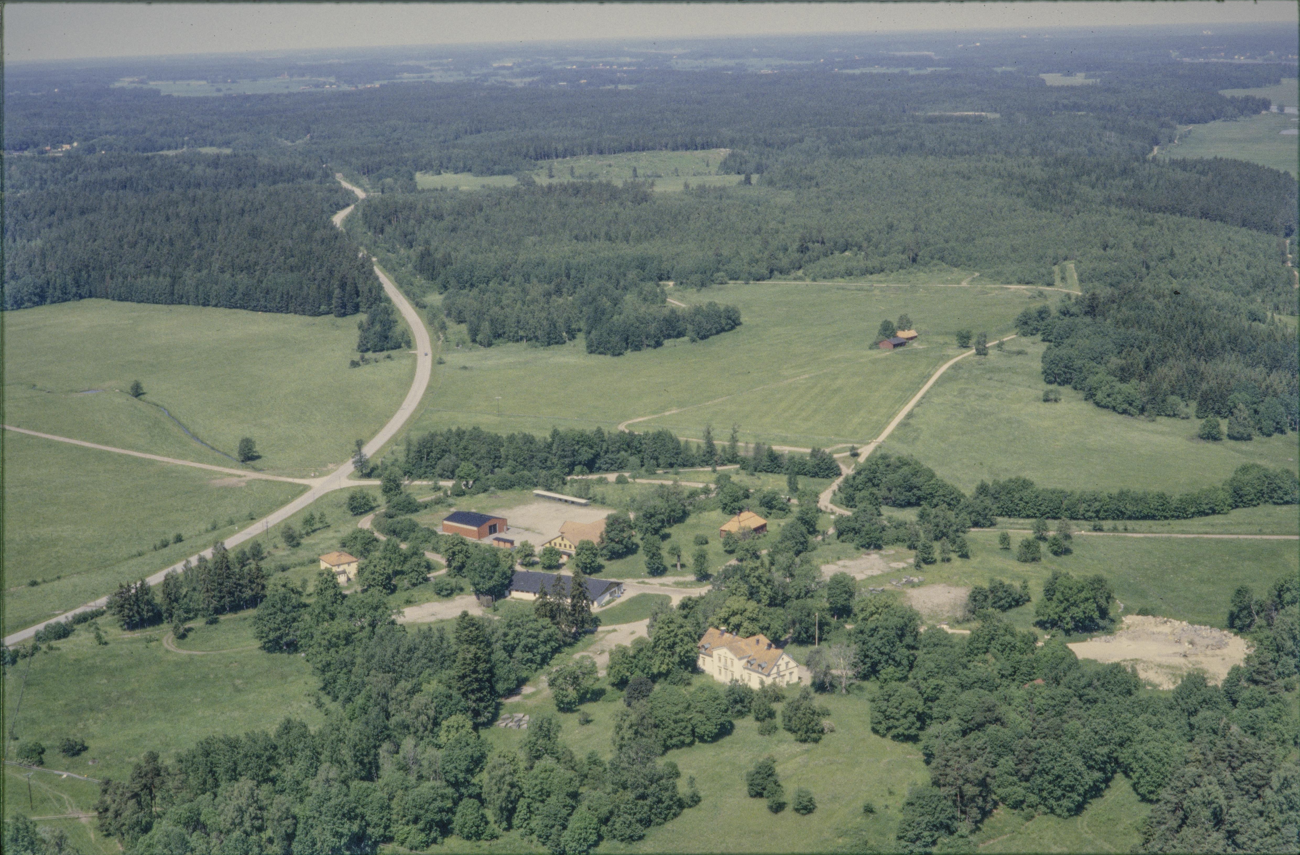 Beskrivning: Tranbygge herrgård. Vid herrgården en kvarn RAÄnr Västra Ryd 149:1. Till vänster i bildens övre del socknet Håbo-Tibble. Bilden är tagen mot (väderstreck): NV
