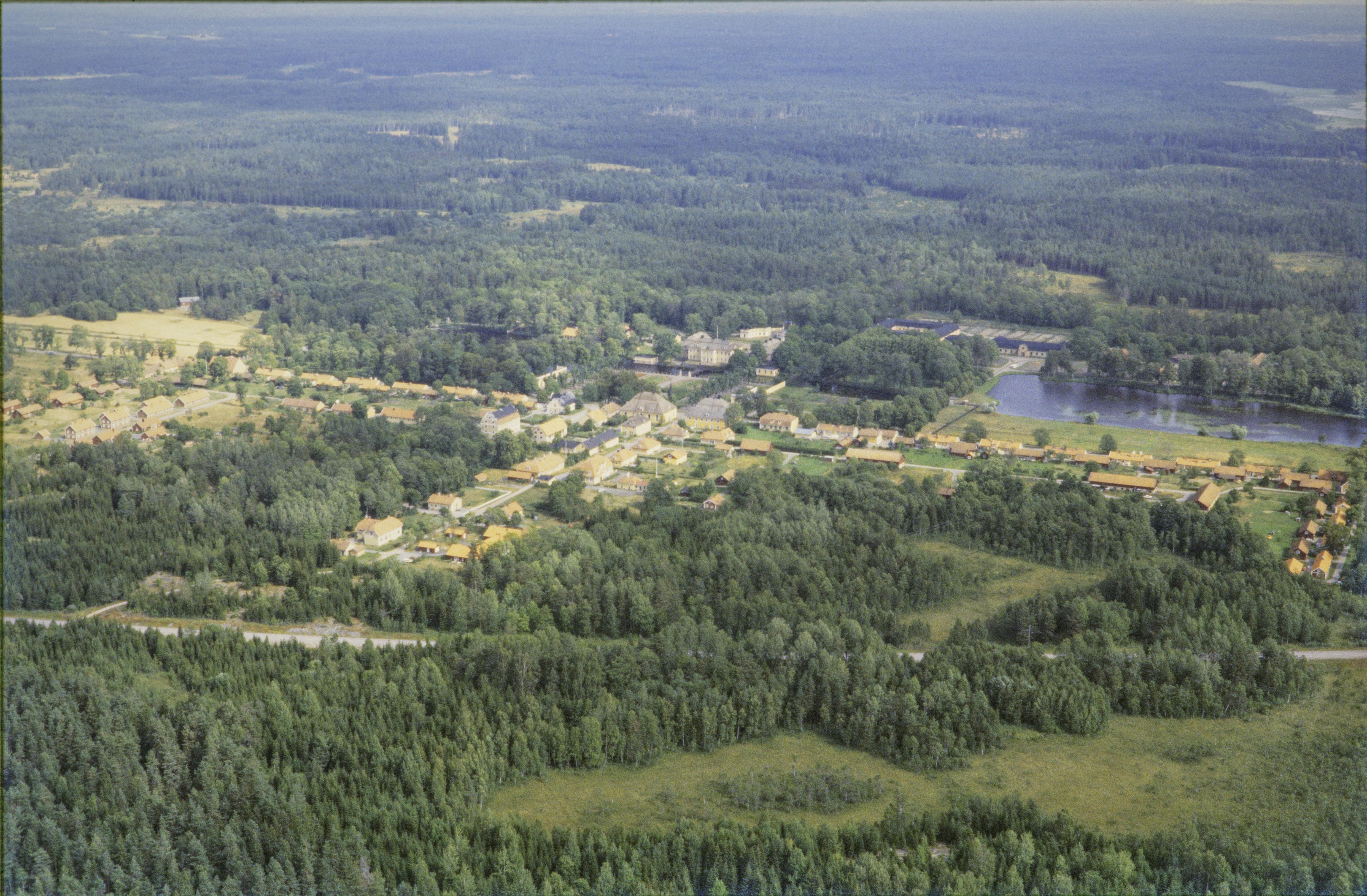 Beskrivning: Lövstabruk (byggnadsminne; skrivs även Lövsta bruk / Leufsta bruk) vid Upplandsleden. Lövstabruks kyrka och herrgård med engelsk park RAÄnr Österlövsta 252-254 vid Bruksdammen vid bildens mitt. Bilden är tagen mot (väderstreck): NO