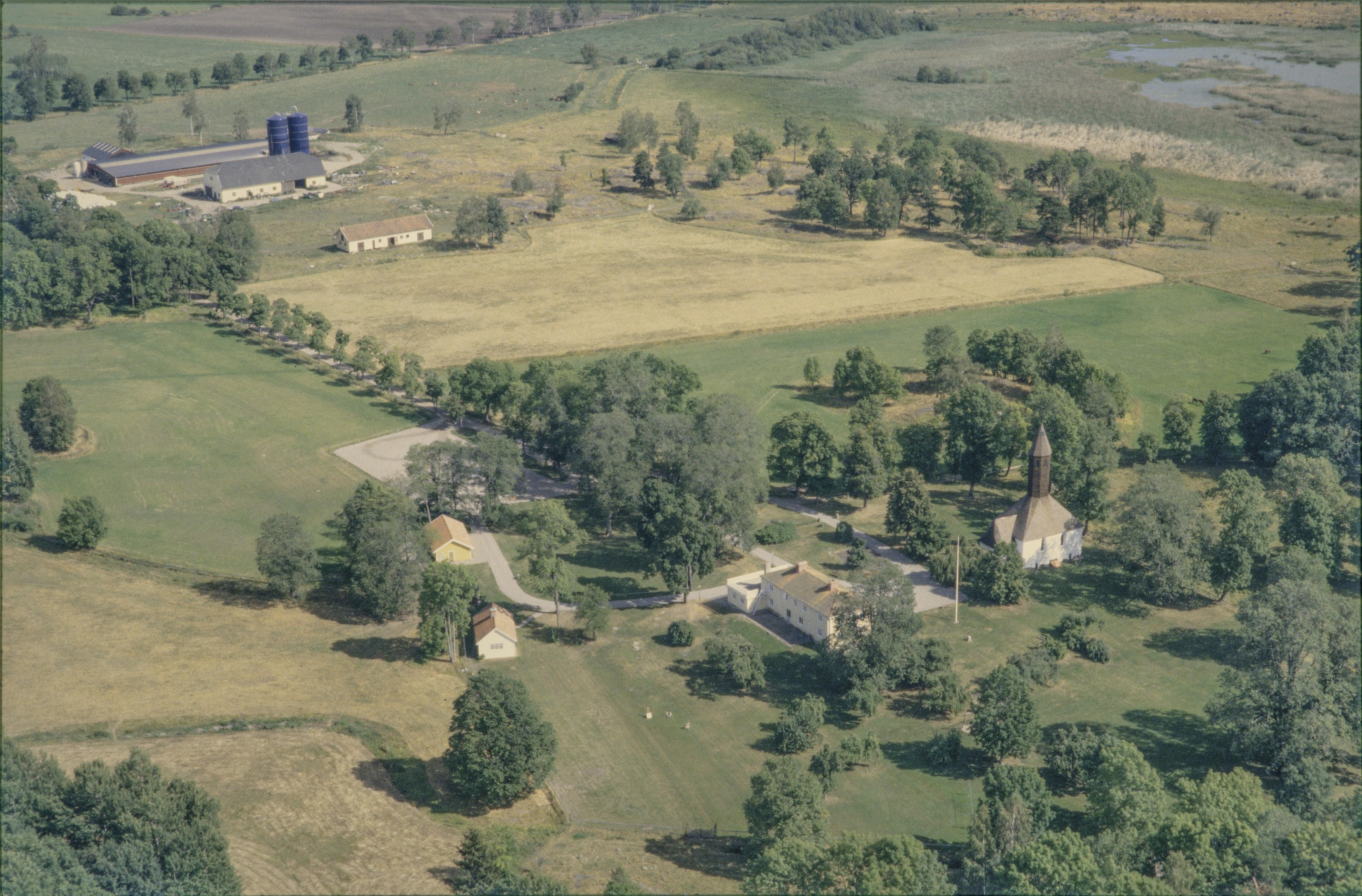 Beskrivning: I bildens nedre del lämningar efter borg / vallgrav RAÄnr Östervåla 359 och bytomt Östervåla 362 vid Aspnäs herrgård norr om sjön Tämnaren. Aspnäs gårdskyrka till höger, Bilden är tagen mot (väderstreck): NO