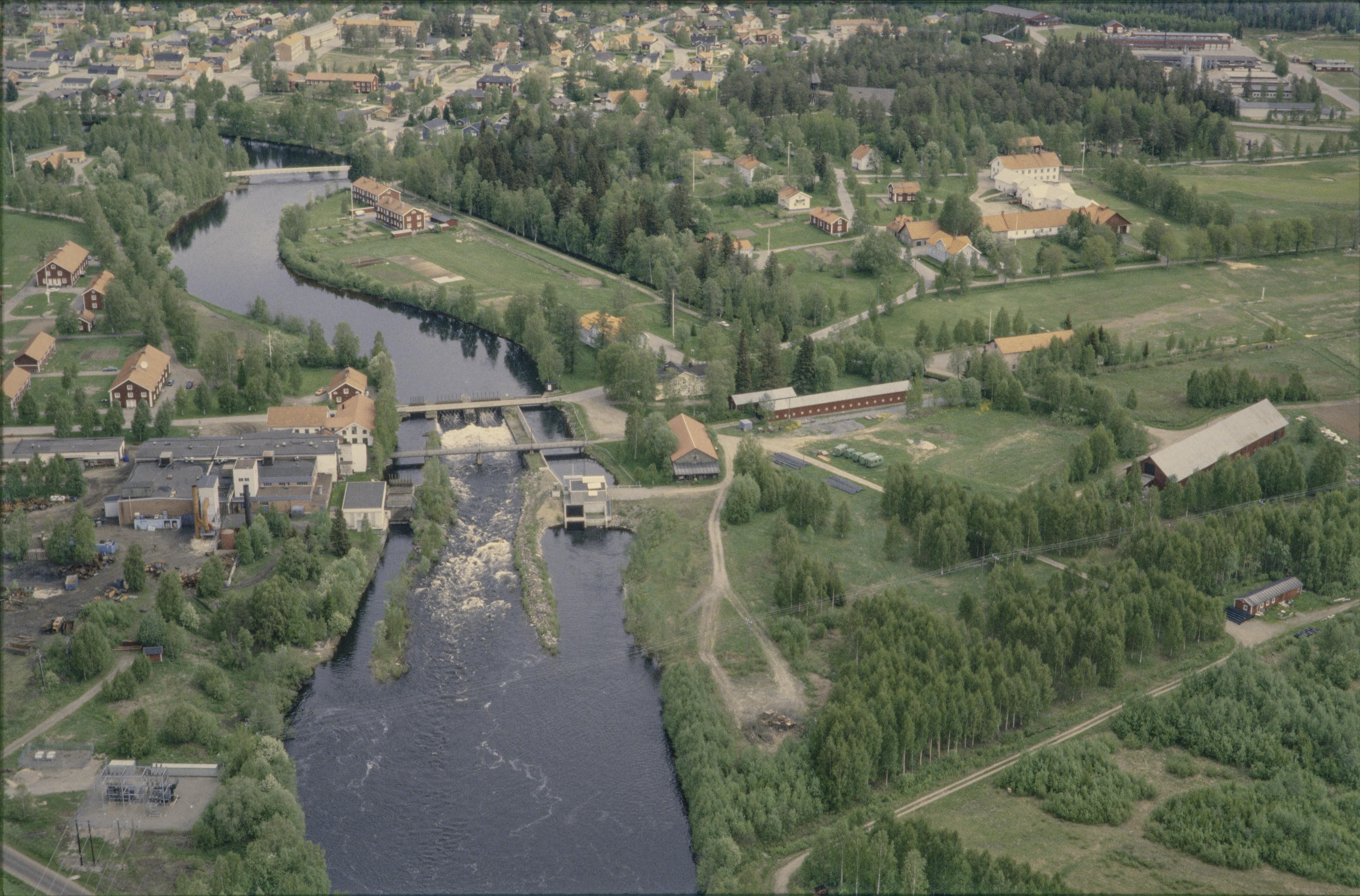 Beskrivning: Robertsfors bruk / järnbruk och tätort i Rickleåns dalgång. Till vänster om bildens mitt hyttlämning RAÄnr Bygdeå 39:1 och hammarområde Bygdeå 40:1. Robertsfors kyrka uppe till höger. Bilden är tagen mot (väderstreck): NNO