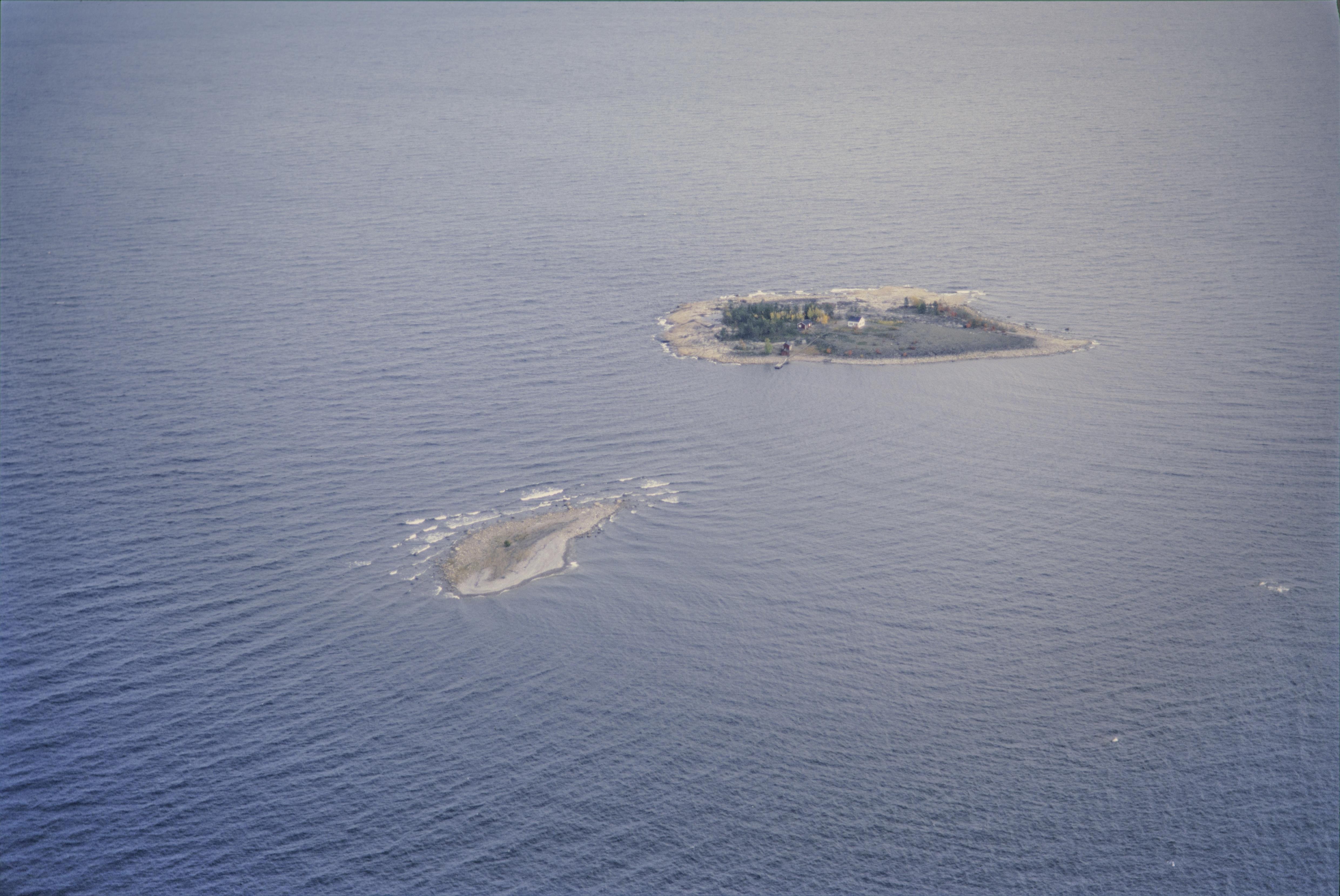 Beskrivning: Holmarna Patran och Hamnskäret (Lotsskäret) öster om Romelsön. På Hamnskäret en f.d. lotsplats med några små byggnader. Bilden är tagen mot (väderstreck): Ö