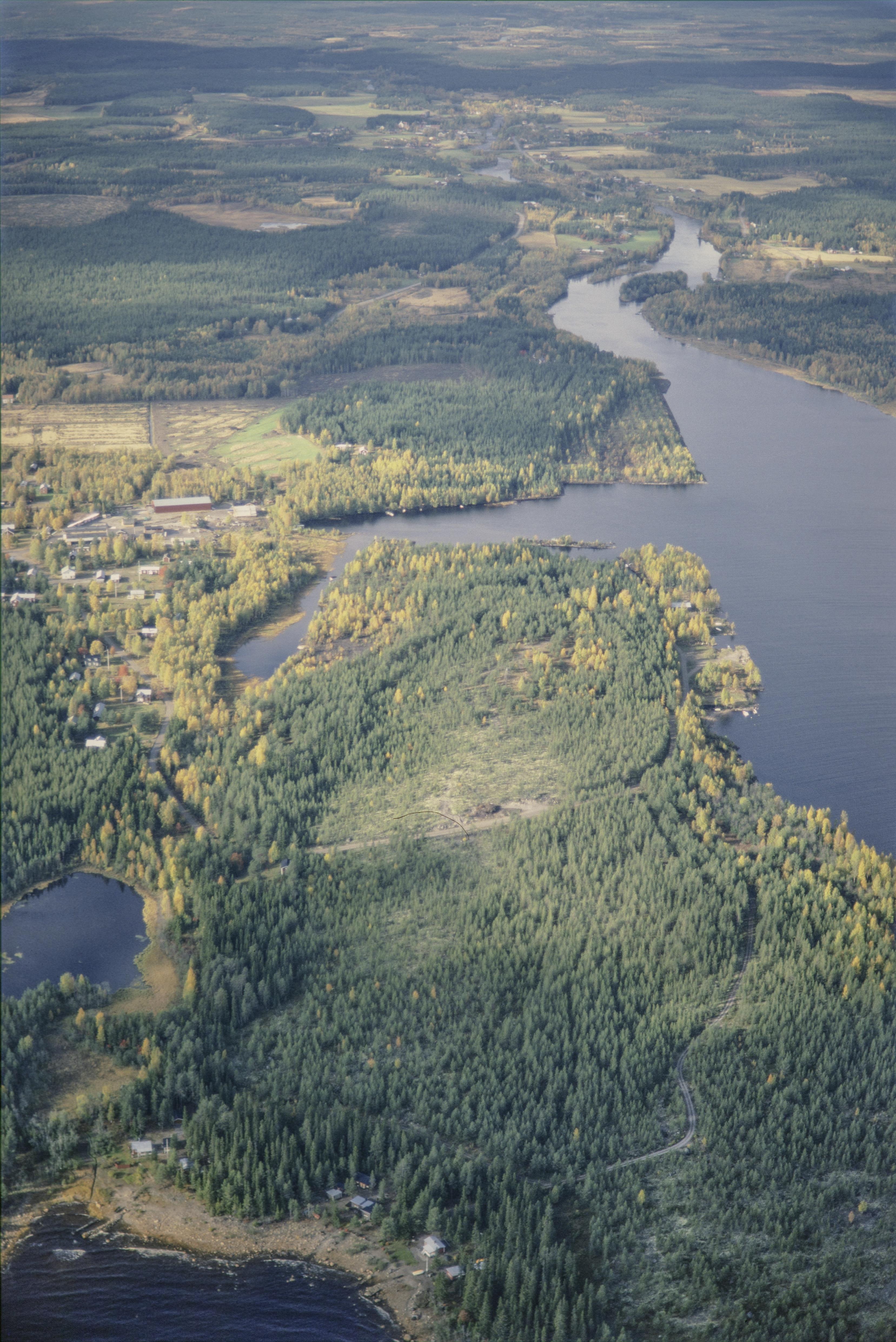 Beskrivning: Åbyälvens mynning i Åbyfjärden. I viken till vänster om bildens mitt orten Renholmen med ett nerlagd sågverk RAÄnr Byske 487:1. I bildens övre del Åbyälvens dalgång vid orten Åbyn m.m. Bilden är tagen mot (väderstreck): NV