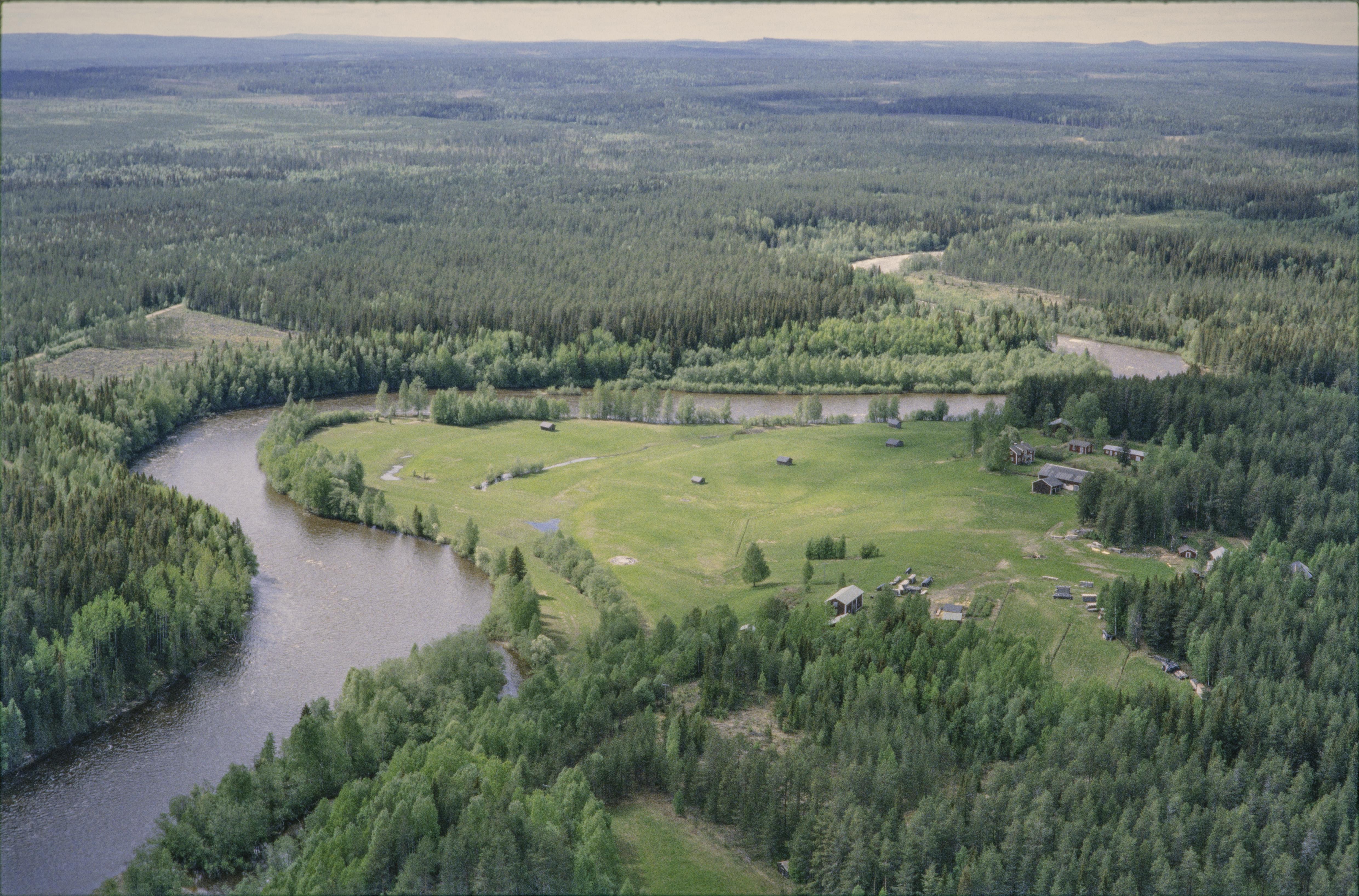 Beskrivning: Byskeälven vid byn Bjurselet. På udden i bildens mitt boplats RAÄnr Byske 495:1, 14:1-2, bytomt Byske 467:1, fångstgrop Jörn 235:1 m.fl. Bilden är tagen mot (väderstreck): V