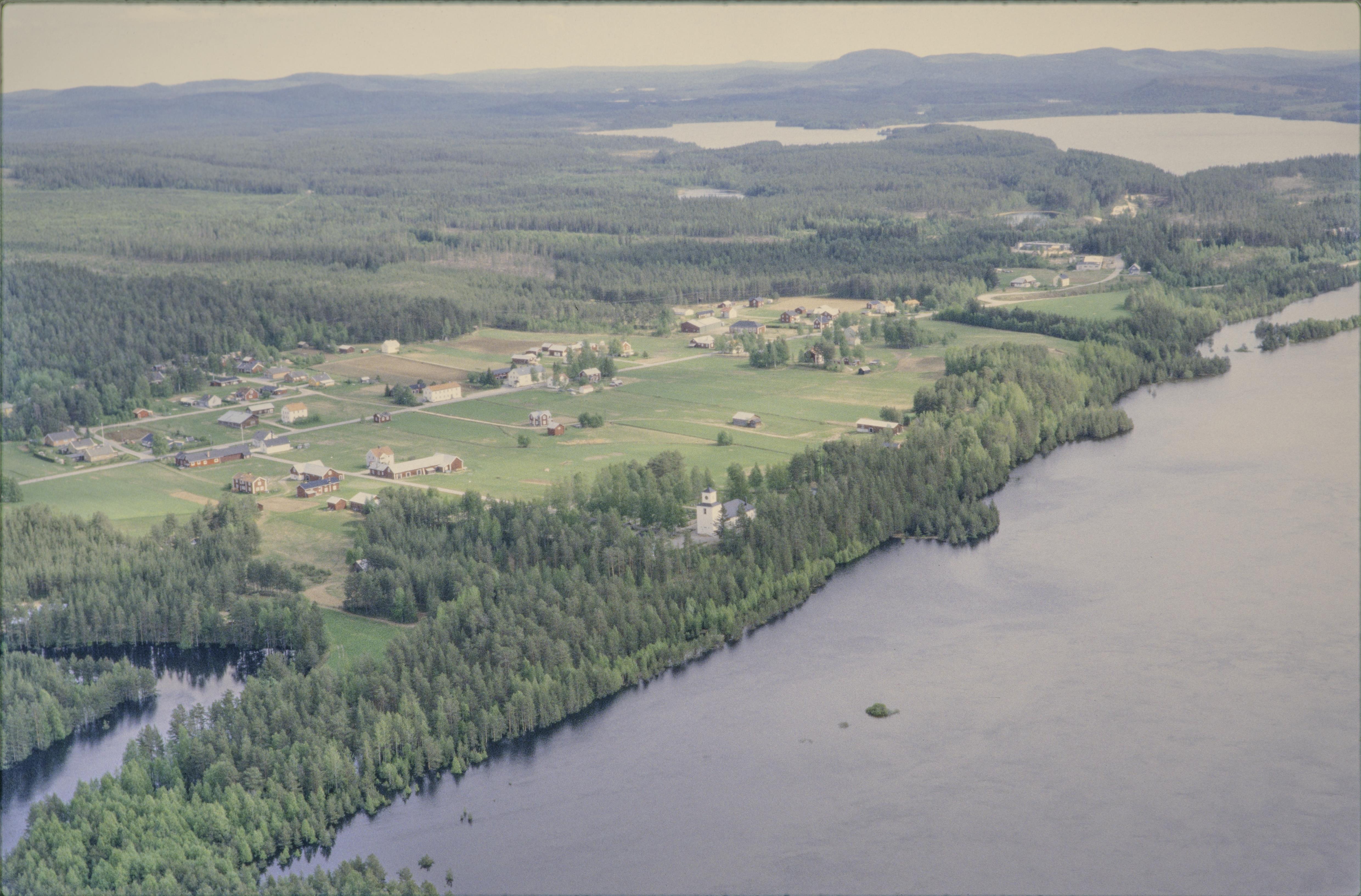 Beskrivning: Åmsele tätort och kyrkby i Vindelälvens dalgång. Vid älvkanten nere till vänster boplats RAÄnr Degerfors 497:1 där älven Åman har sitt utlopp i Vindelälven. Åmsele kyrka under bildens mitt. Bilden är tagen mot (väderstreck): OSO