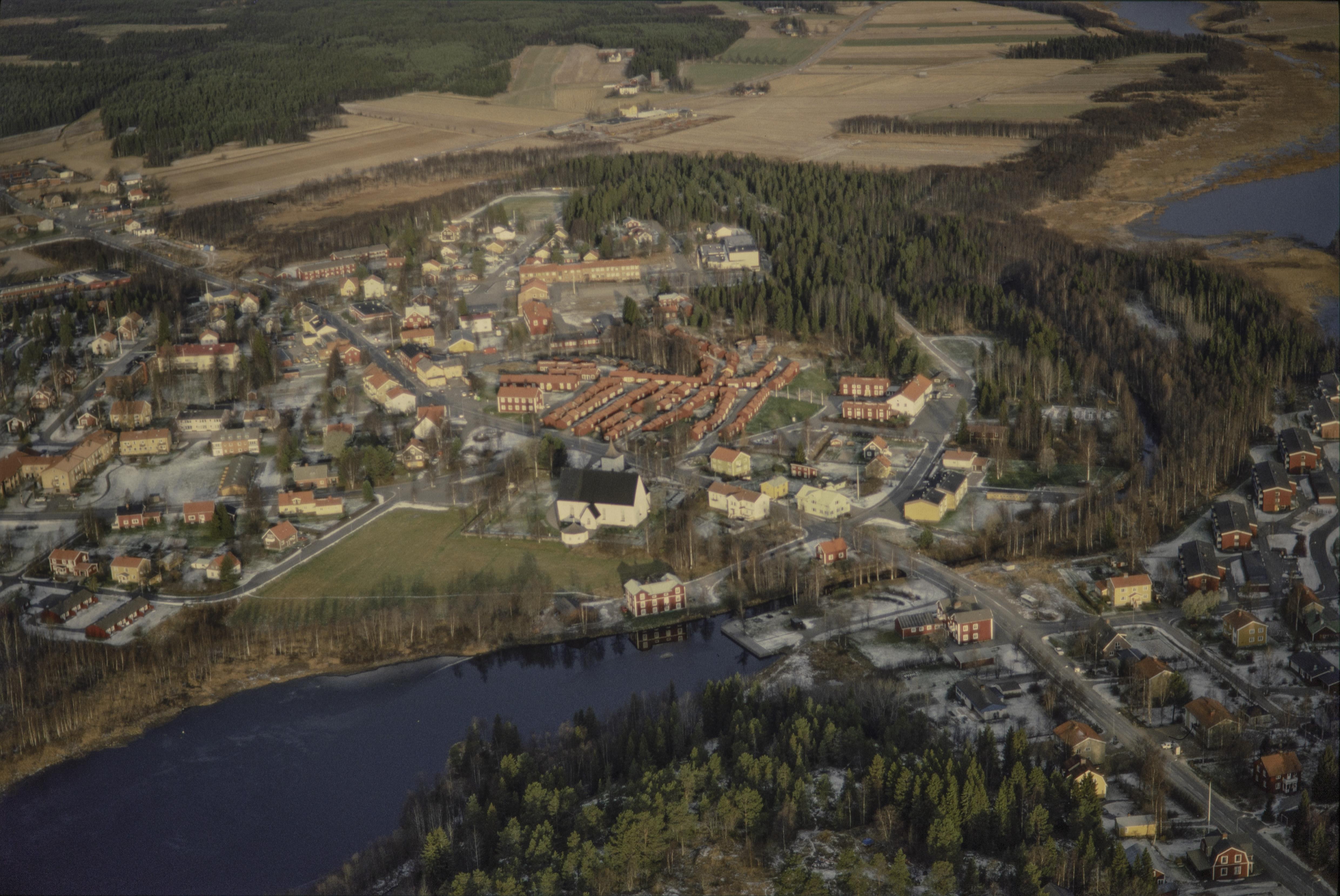 Beskrivning: Lövångers tätort och kyrkby mellan sjöarna Gärdefjärden och Avafjärden. Vid bildens mitt Lövångers kyrka och Lövångers kyrkstad RAÄnr Lövånger 85:1. Bilden är tagen mot (väderstreck): NV