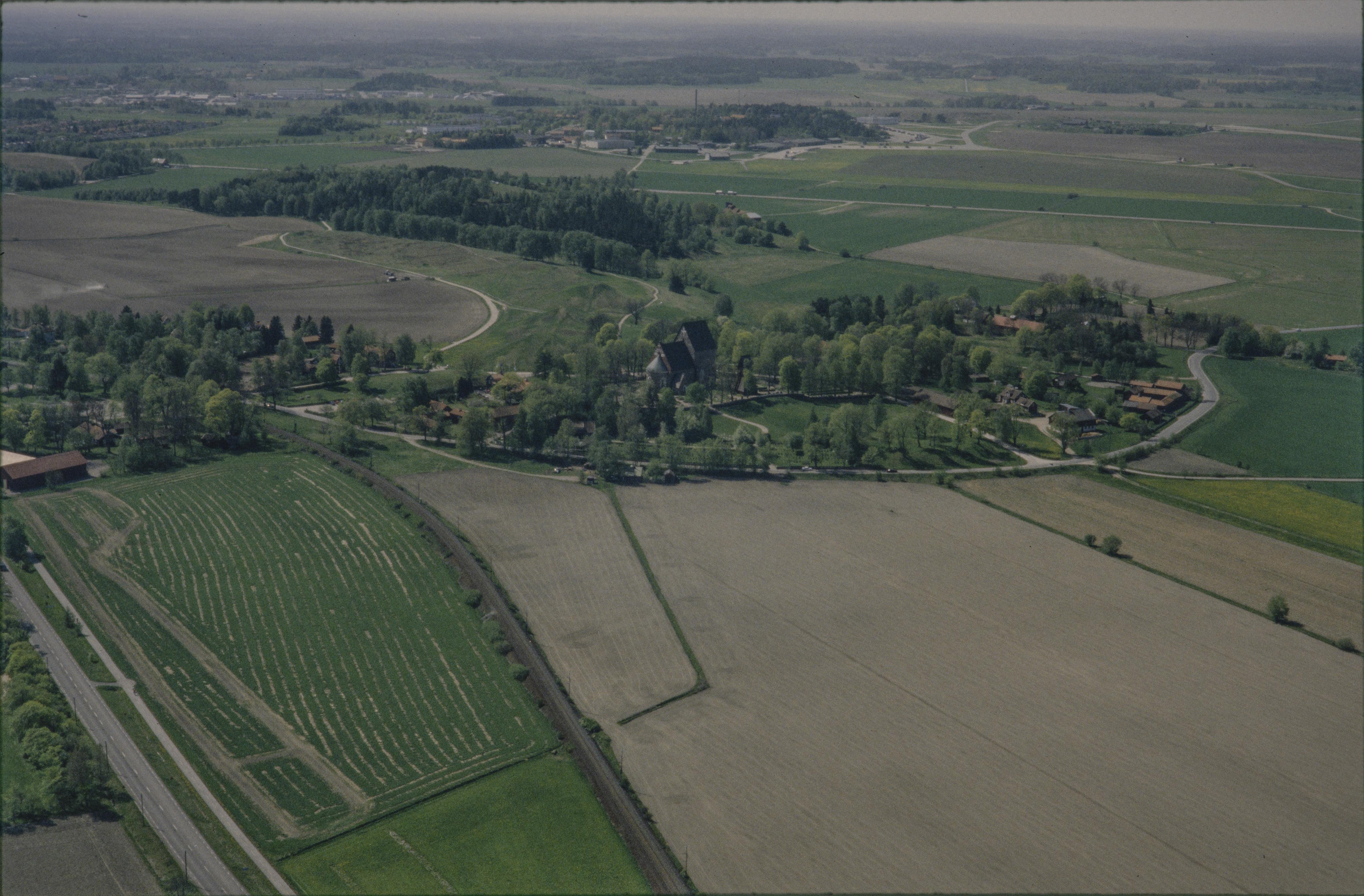 Beskrivning: Fyrisåns dalgång. Över bildens mitt Gamla Uppsala kyrka RAÄnr Uppsala 774, Kungshögarna gravfält Uppsala 123:1, boplats Uppsala 263:1 m.fl. Bilden är tagen mot (väderstreck): SV